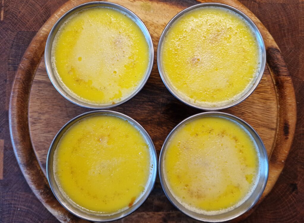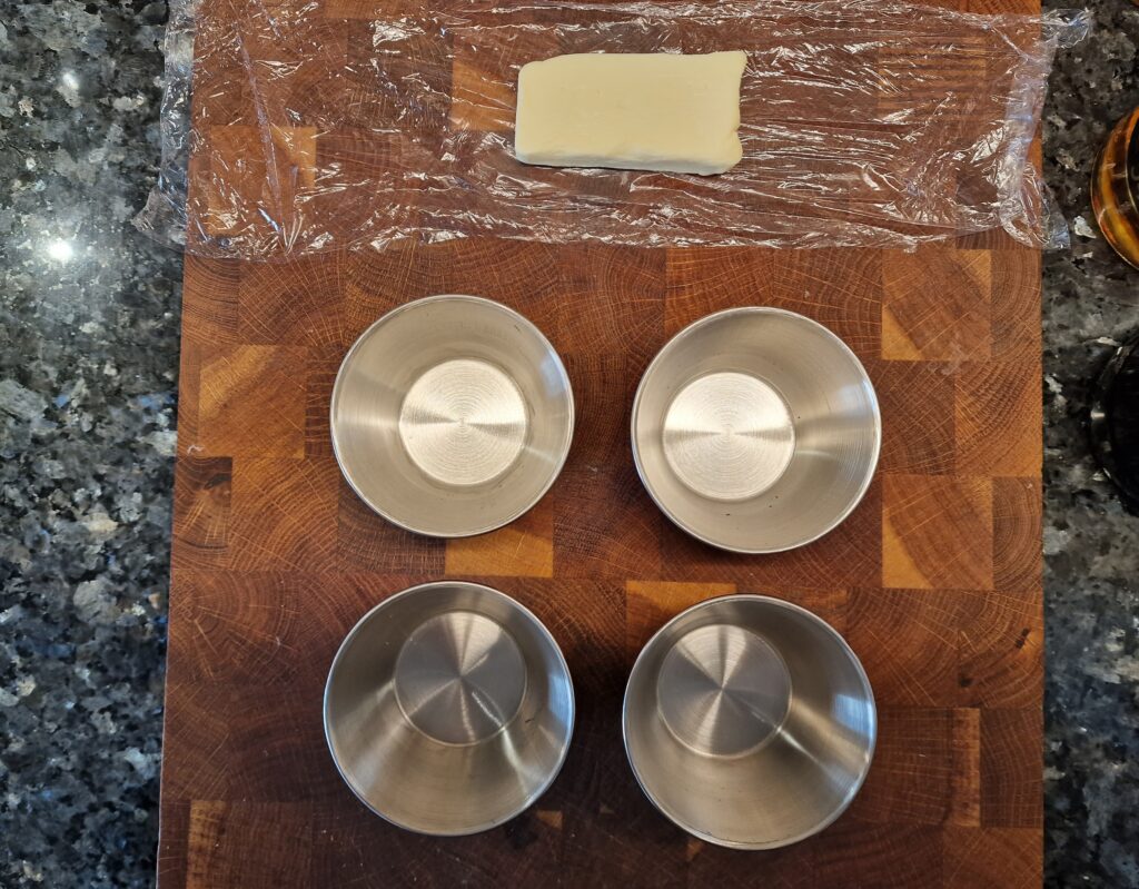 Für dies Rezept werden Puddingförmchen aus Metall von 7-8 cm Durchmesser benötigt, die mit etwas Butter ausgerieben werden.