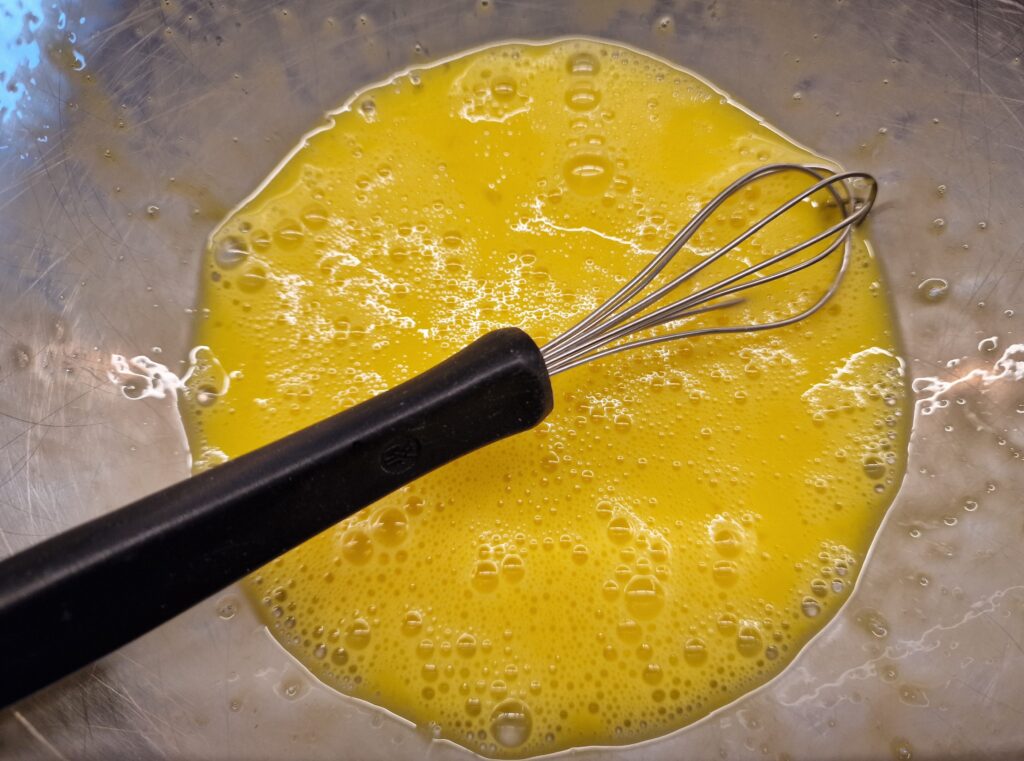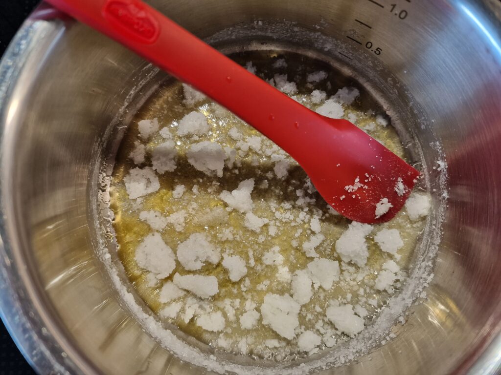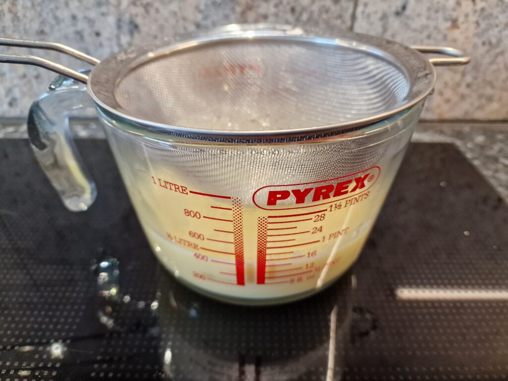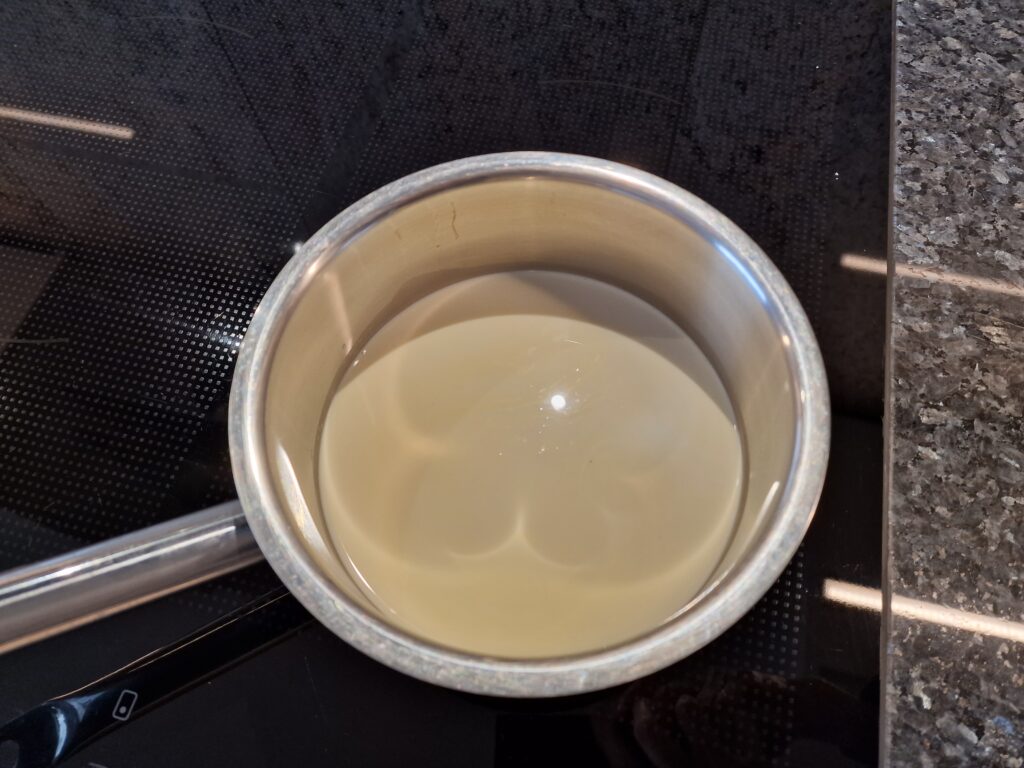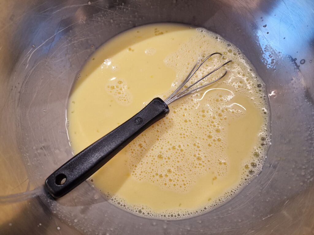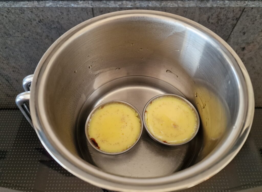 Zur Herstellung des Puddings werden die zwei Eier in einer Schüssel glatt verrührt. Separat werden Milch, Sahne und Zucker zusammen aufgekocht. Im Anschluss wird die heiße Mischung langsam und löffelweise zu den Eiern gegeben und dabei immer wieder gut verrührt, so dass das Ei nicht gerinnt. Die Mischung aus Milch und Eiern wird nun durch feines Sieb langsam in die Puddingförmchen gegeben.