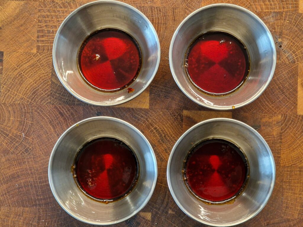 Nun wird der Pudding im Ofen fertig gestellt. Hierzu eine Auflaufform (z.B. 20 mal 30 cm) als Wasserbad nutzen. Dazu die Auflaufform zu etwa zwei Dritteln mit heißem Wasser füllen und dann die Förmchen vorsichtig hinein setzen. Das Ganze für eine halbe Stunde im auf 140°C (Umluft) vorgeheizten Ofen backen, bis der Pudding eingedickt ist. Im Anschluss werden die Puddingförmchen über Nacht in den Kühlschrank gestellt.