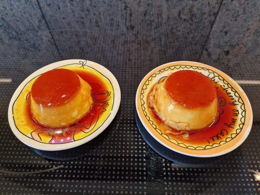 Jetzt kommt der letzte Schritt vor dem Servieren: Hierzu werden die Puddingförmchen kurz in heißes Wasser getaucht und der Rand mit einem spitzen Messer gelöst. So gelöst kann der Inhalt auf ein Dessertschälchen gestürzt und direkt serviert werden. Dabei bleibt die unterste Karamellschicht als durchsichtige Scheibe im Gefäß, kann vorsichtig unter Wasser entnommen und als Dekoration verwendet werden – es muss dann aber innerhalb von etwa 5 Minuten serviert werden, bevor die Scheibe sich wieder verflüssigt. Im Kühlschrank halten sich unwahrscheinliche Reste etwa 48 Stunden.