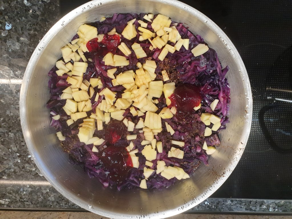 Rotkohlkopf teilen und fein schneiden. Im großen Topf mit etwas Gänseschmalz andünsten, ca. 200 ml Wasser hinzugeben um ein Ansetzen zu verhindern. Kochen lassen. In der Zwischenzeit 2 Äpfel schälen und in kleine Stückchen schneiden, zum Rotkohl geben und unterrühren. Später Preiselbeeren, Johannisbeergelee und gemahlene Gewürze zugeben, umrühren und weiter 2-3 Stunden köcheln lassen, bis der Rotkohl durch ist. Nun den Rotkohl pürieren und das Püree in der Pfanne noch etwas reduzieren. Dabei können durch Würzen mit Curry oder Chili noch unterschiedliche Geschmacksrichtungen zusätzlich bereitet werden.