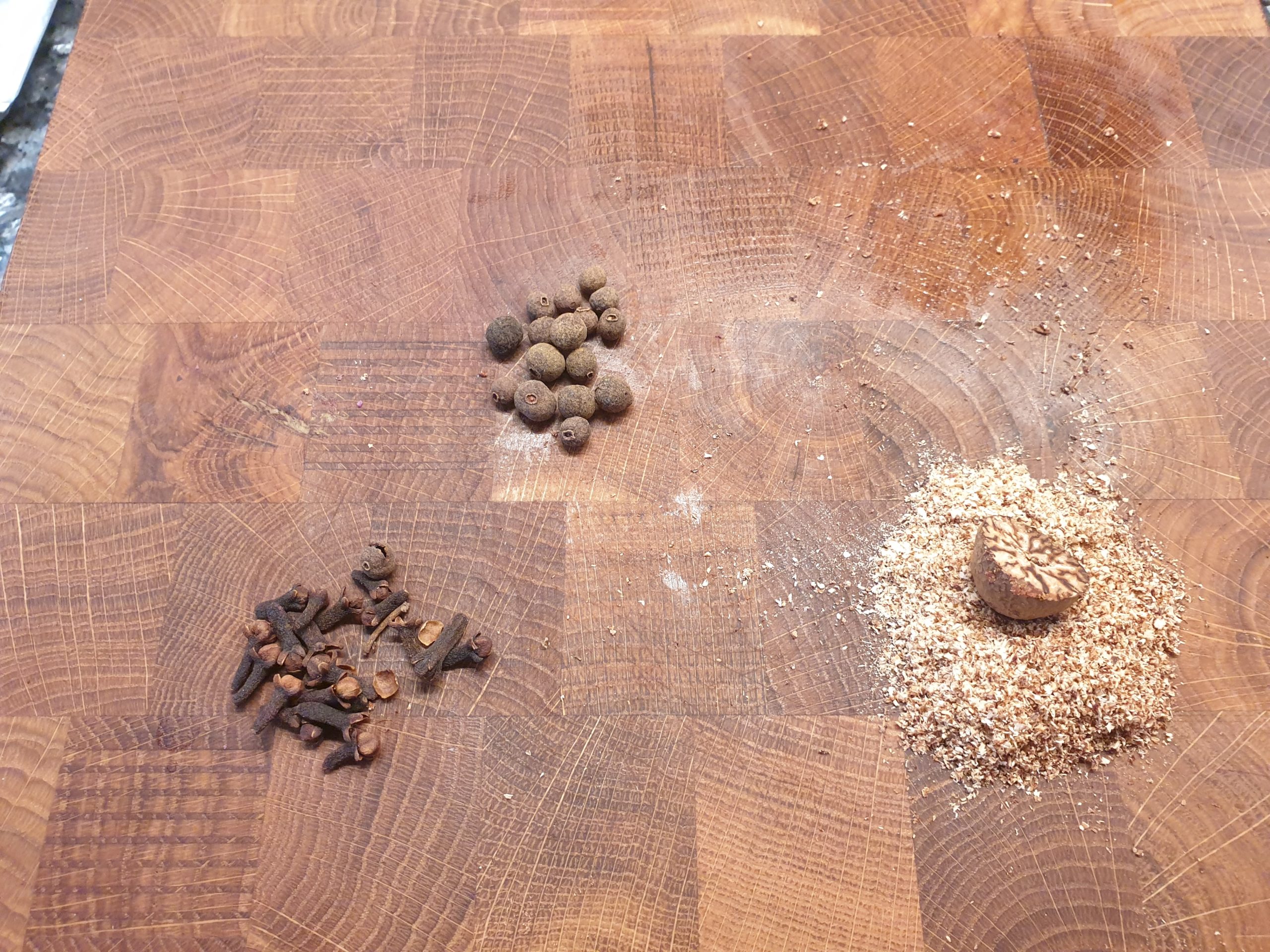 - geriebene Gewürze: Muskatnuss, Nelken, Wachholderbeeren, Pfeffer
