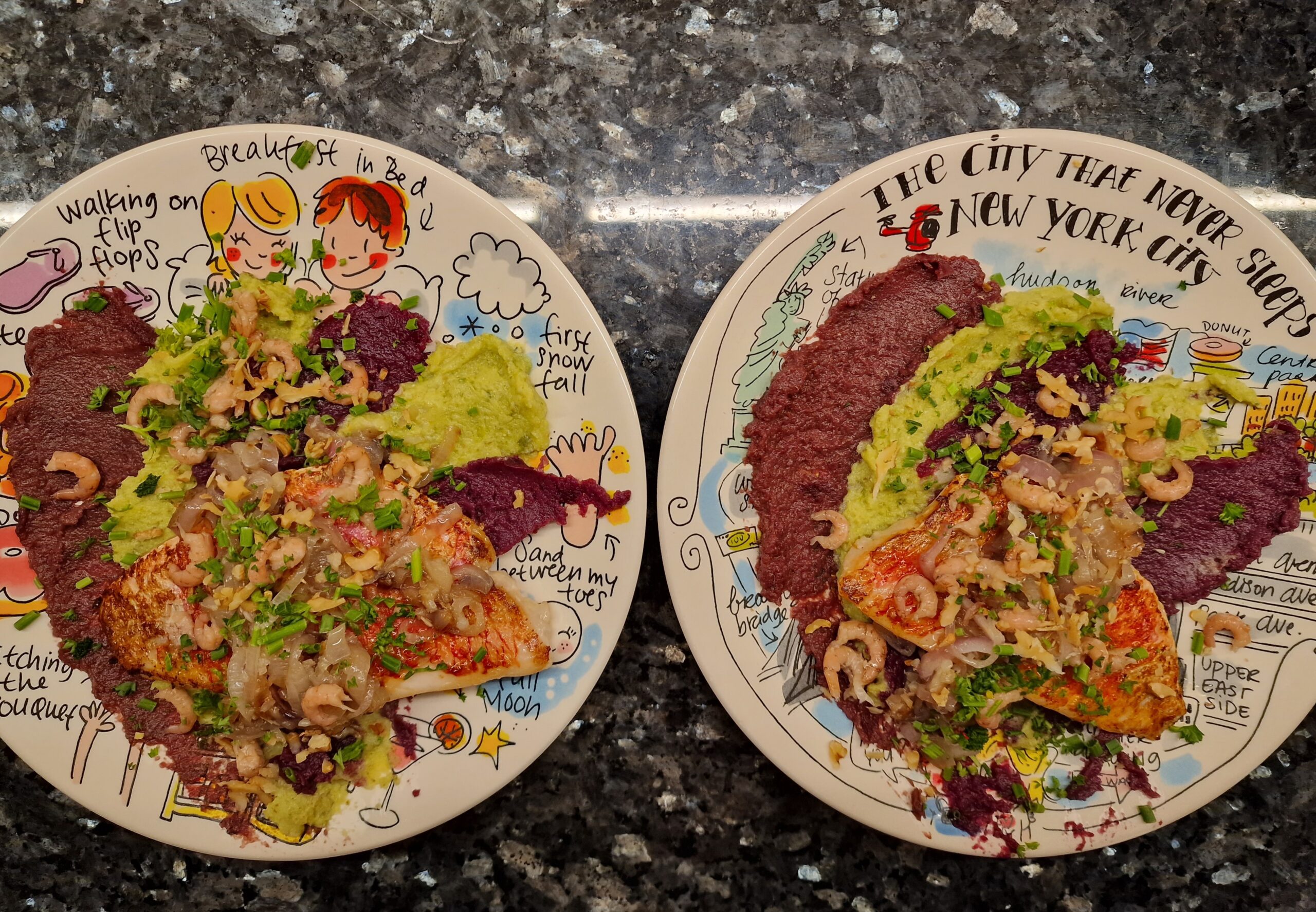 Separat Zwiebeln, Knoblauch und Ingwer kurz in Butter mit einer Prise Salz anbraten. Separat die gesäuerten und leicht gesalzenen Fischfilets kurz scharf anbraten. Das Fischfilet wird auf dem Rotkohlpüree und Rosenkohlpüree angerichtet, mit Garnelen garniert und mit Kräutern und Walnussplittern überstreut serviert.