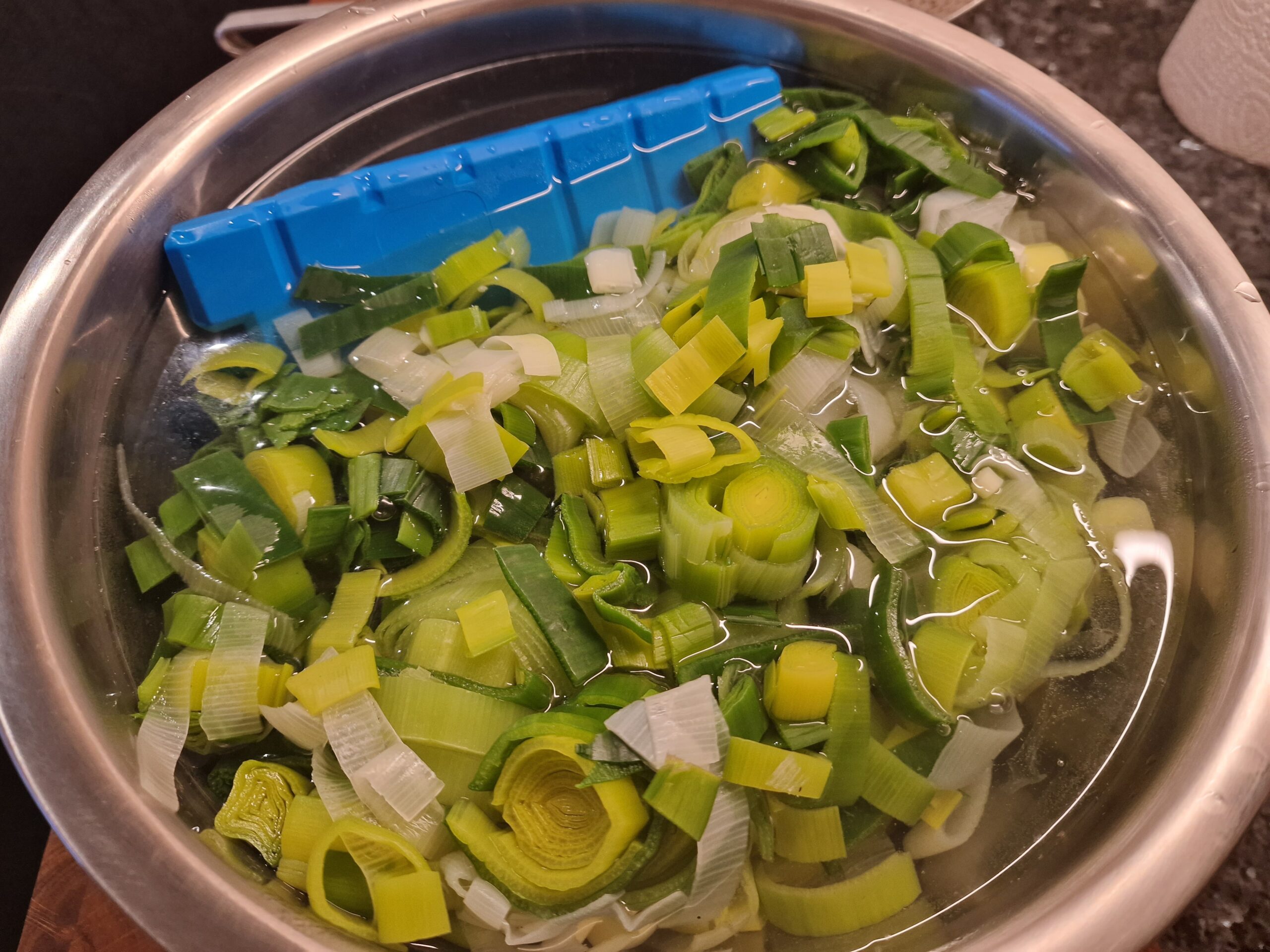 - Porree im Eiswasser anschließend abschrecken, trocknen lassen oder trocken tupfen.