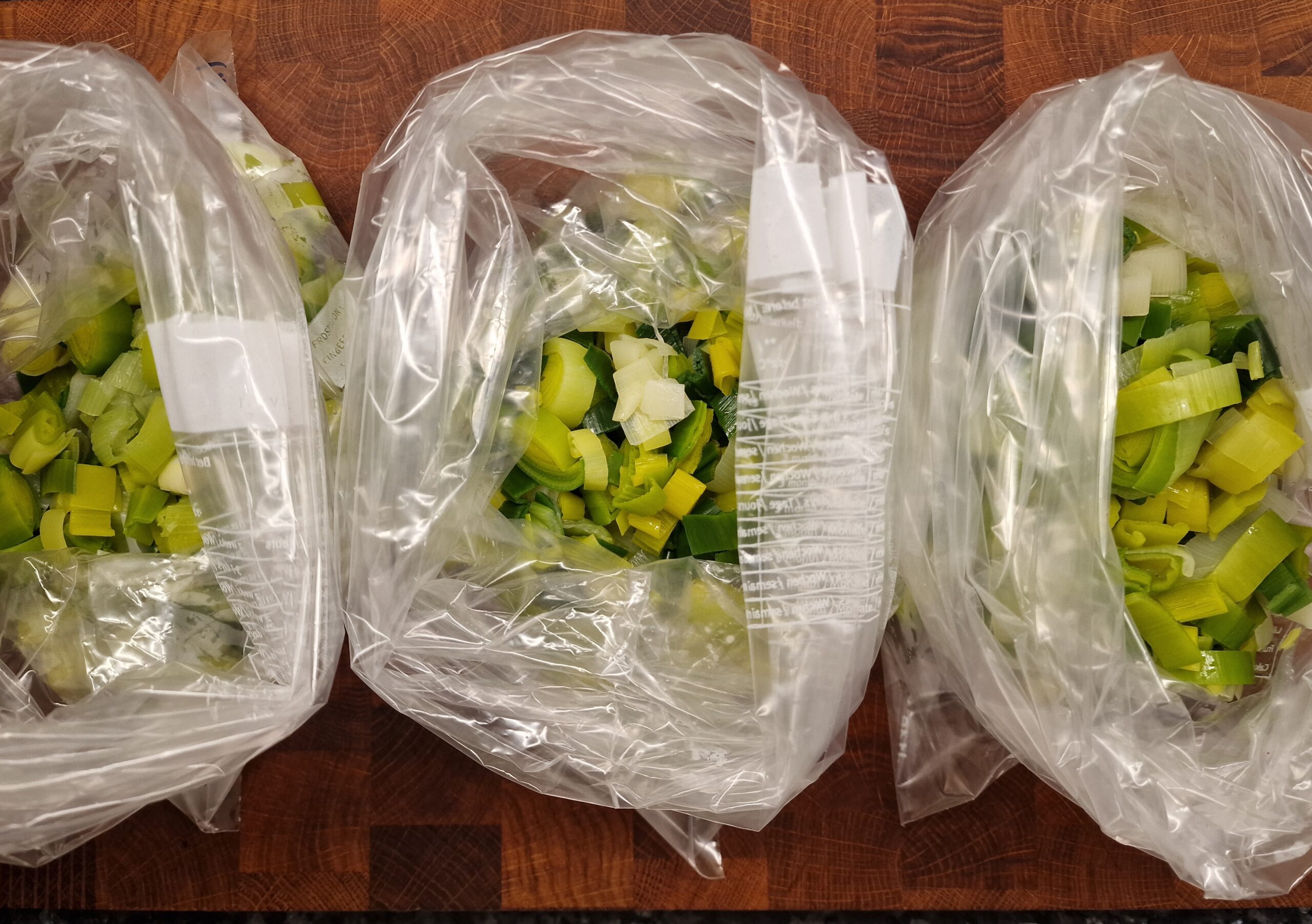 - Porree-Scheiben portionsweise in Gefrierbeutel geben und tiefgefrieren.