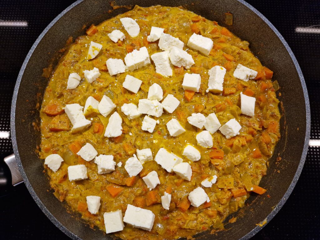 Möhren und – falls gewünscht optional Erbsen – zugeben und garen lassen. Zum Schluss die Kokosnuss Milch unterrühren und Paneer hineingeben.