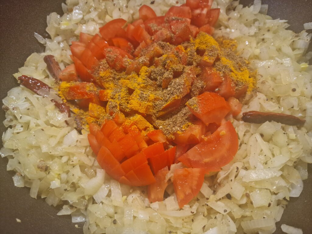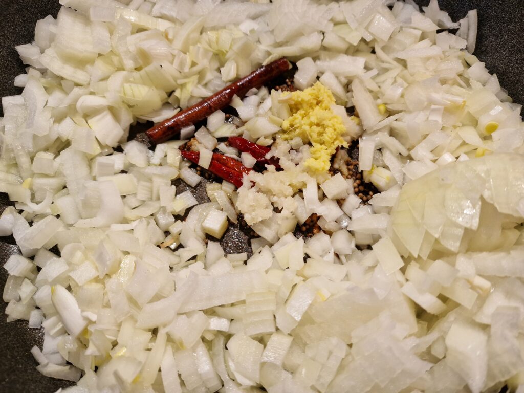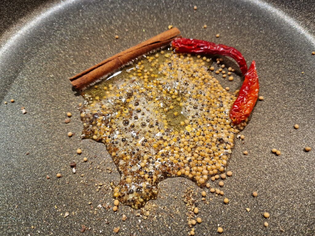 Öl in der Pfanne erhitzen und Senfkörner, Zimt, Kardamom, Pfefferkörner und grüne Chili leicht anrösten. Anschließend Ingwer, Knoblauch und Zwiebeln hinzufügen und anbraten bis die Zwiebeln goldbraun sind. Danach Tomaten, Kurkuma, Koriandersamen, Chilipulver und Salz zugeben und das Ganze 6-8 Minuten köcheln lassen, bis die Sauce eine sämige Konsistenz hat.