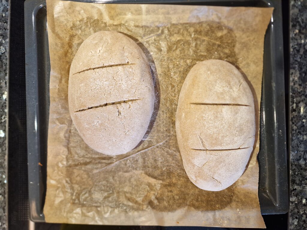 Die Teighälften zu einem Ball kneten, dann in Roggenmehl wälzen und in bemehlte Gärkörbe oder auf ein mit Backpapier bereits ausgelegtes Blech legen. Nun eine zweite Teigruhe für etwa 40 Minuten einhalten.