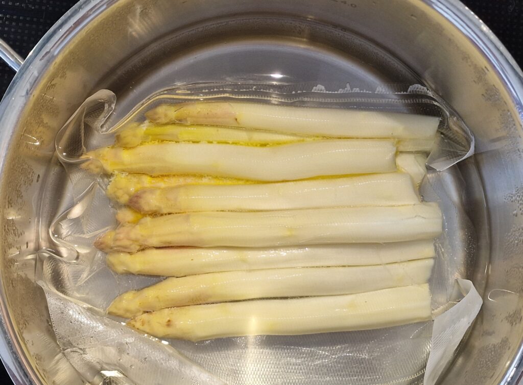 Spargel schälen, mit 10 g Butter und etwas Zucker vakuumieren und im heißen Wasserbad 25 Minuten bei etwa 80°C ziehen lassen (E-Herd Stufe 3).