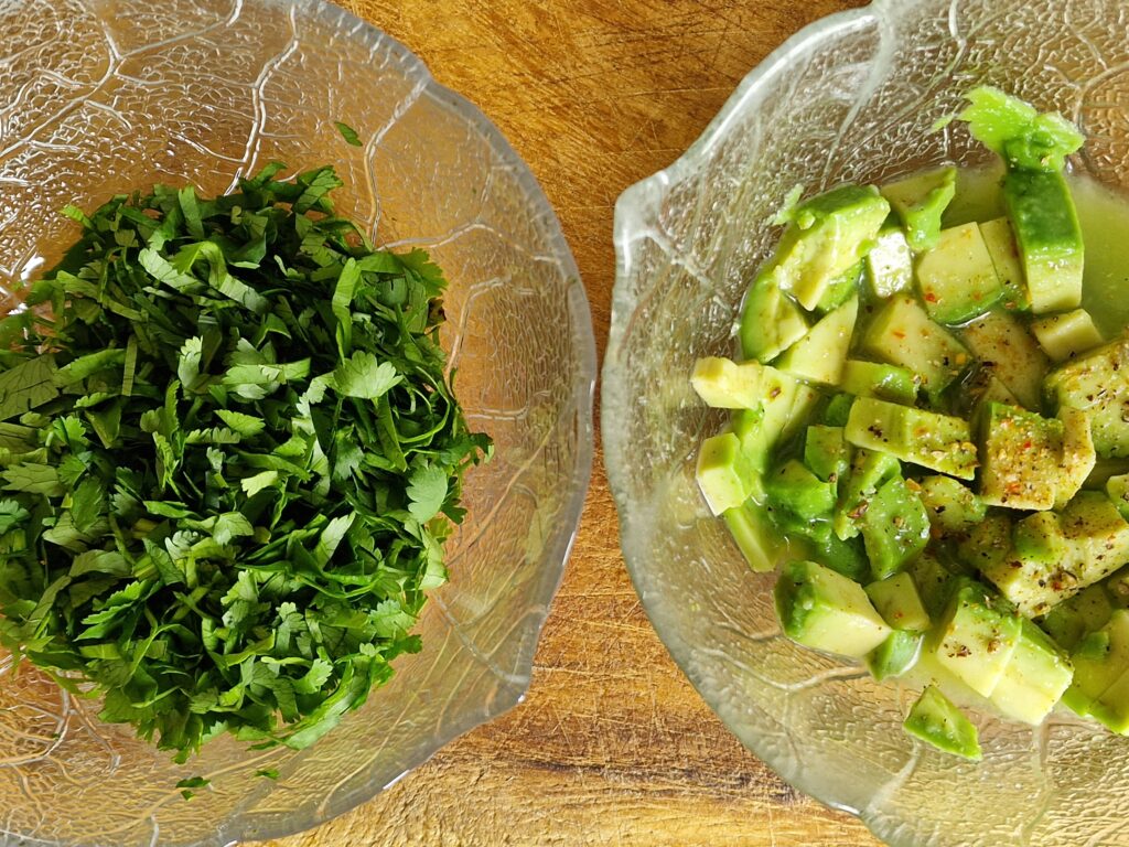 Avocado längs aufschneiden, aufdrehen, entkernen, in der Schale in kleine Würfel schneiden und mit Limette beträufeln, mit Pfeffer und Chili überstreuen.