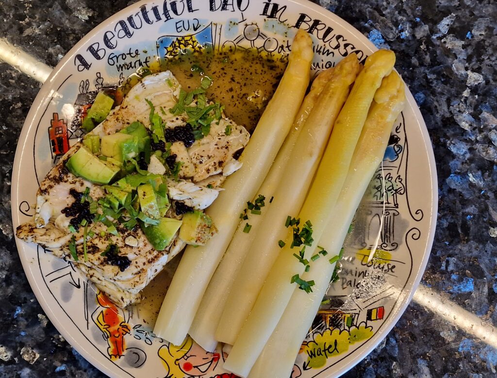 Spargel mit Kabeljau (Skrei) ist eine leckere Kombination, hier mit Avocado und Kaviar. Das Rezept ist angeregt durch eine wunderbare Mahlzeit in Riga.