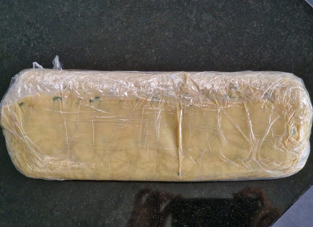 Die Schnittkäsescheiben auf einem großen Stück Frischhaltefolie im Rechteck eng aneinander auslegen.