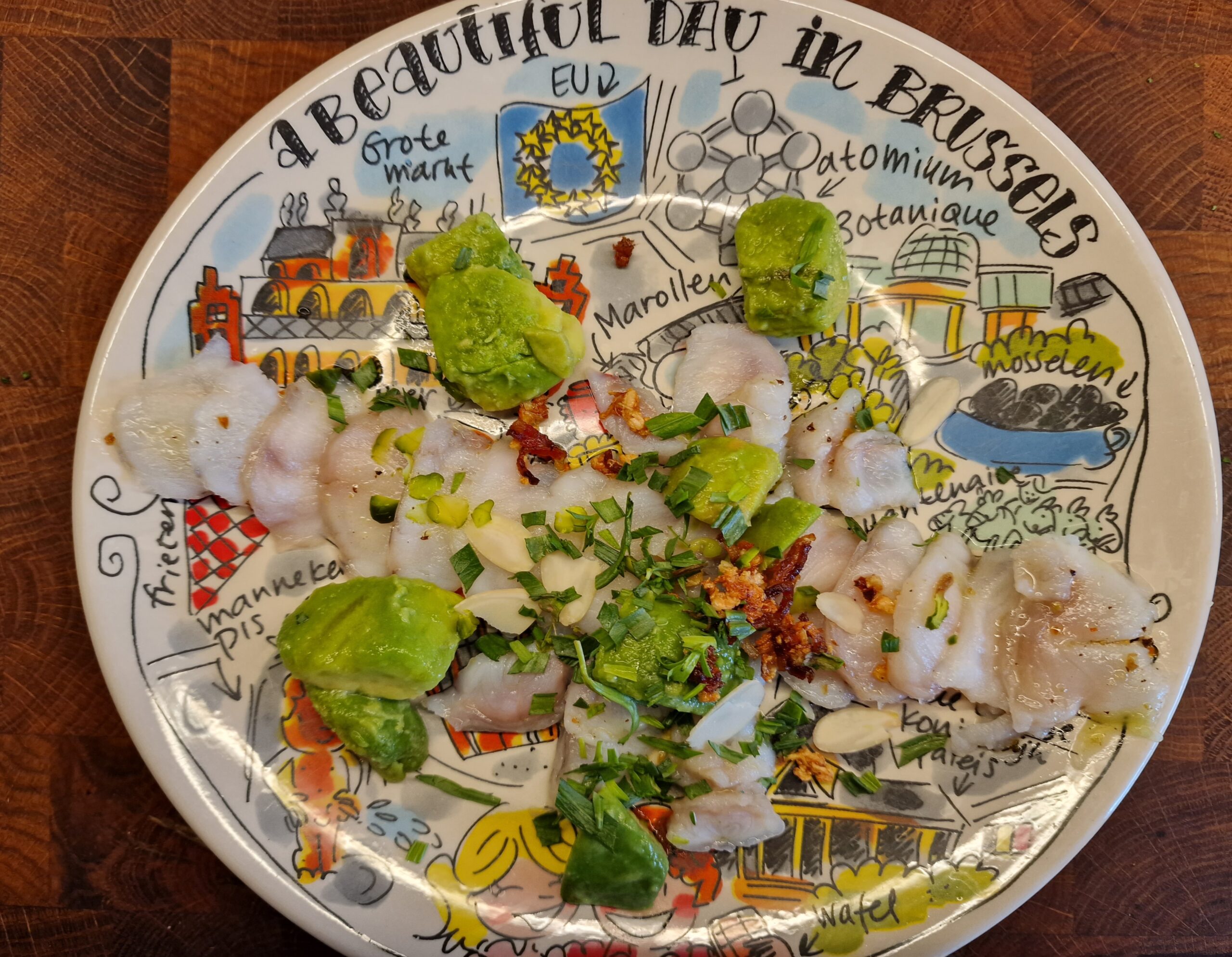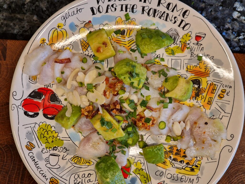 Zum Servieren Seeteufel Carpaccio leicht trocknen, anrichten, gewürfelte Avocado darüber verteilen und mit dem Dressing übergießen. Mit den fein gehackten Kräutern und Pistazienkern- oder Mandelblättchen überstreut servieren. Dazu schmeckt zum Beispiel Spargel klassisch sous-vide zubereitet und grüner Salat mit Joghurtsauce.