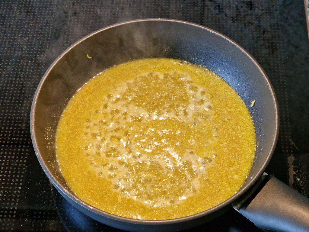Für die Sauce Ingwer und Knoblauch im Olivenöl anbraten. Honig und die Gemüsebrühe zugeben und mit dem Limettensaft kräftig aufkochen lassen. Darauf die Herdplatte ausstellen und mit dem Schneebesen die eiskalte Butter unterziehen bis zur gewünschten Konsistenz der Sauce. Mit Salz und Piment abschmecken und zum Schluss den Thymian zugeben.