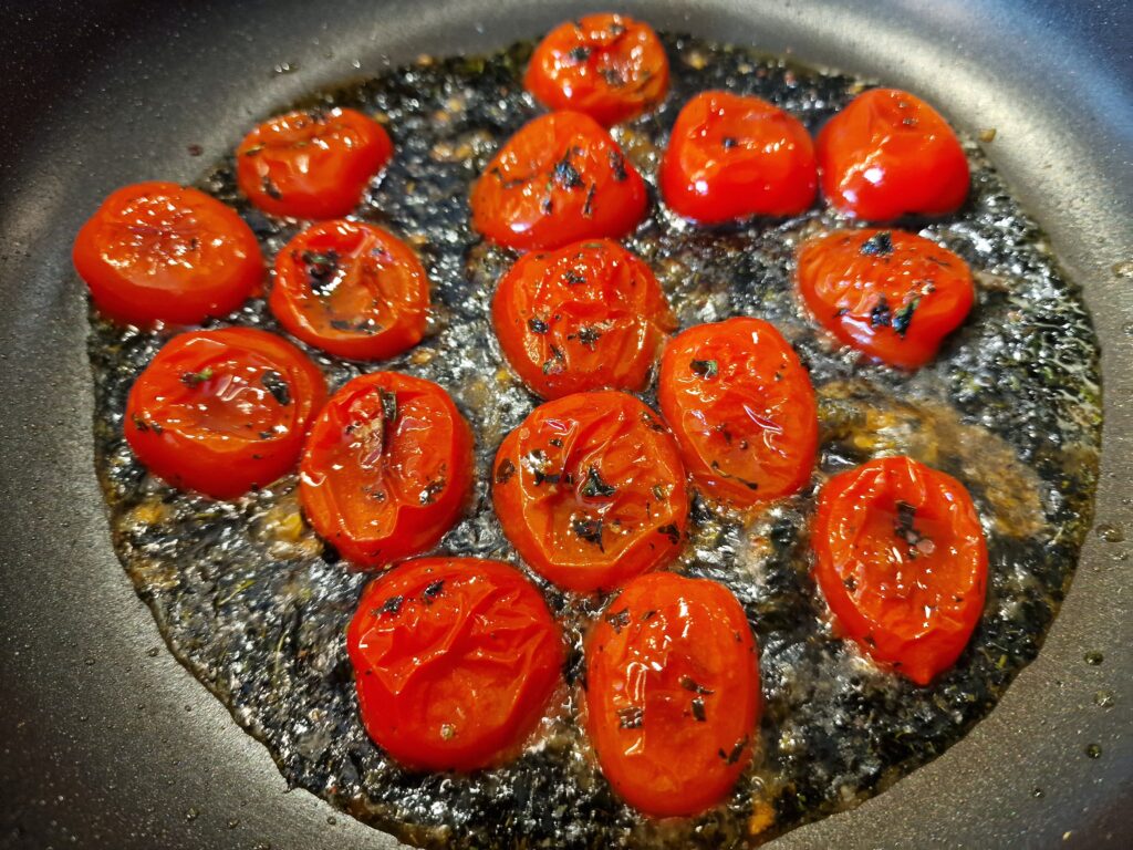 Separat Kirschtomaten mit Oregano in Olivenöl kurz anbraten und zum Schluss der Suppe zugeben.