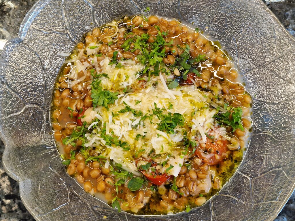 Hartkäse zum Schluss zugeben und das Ganze zum Servieren mit Petersilienresten überstreuen. Dazu die Weizenkörner servieren, mit etwas Limettensaft und Petersilie zum Abschmecken anbieten.