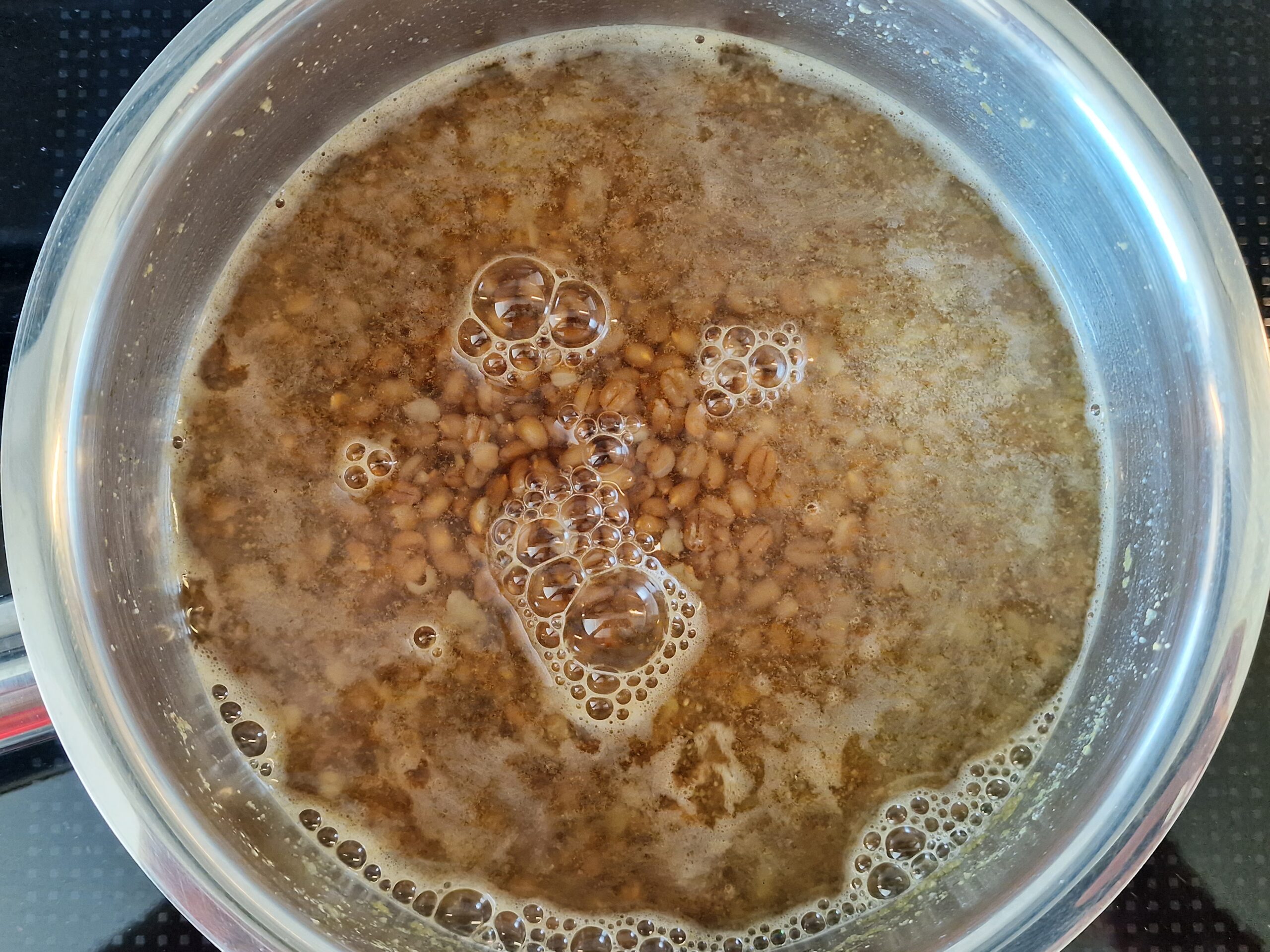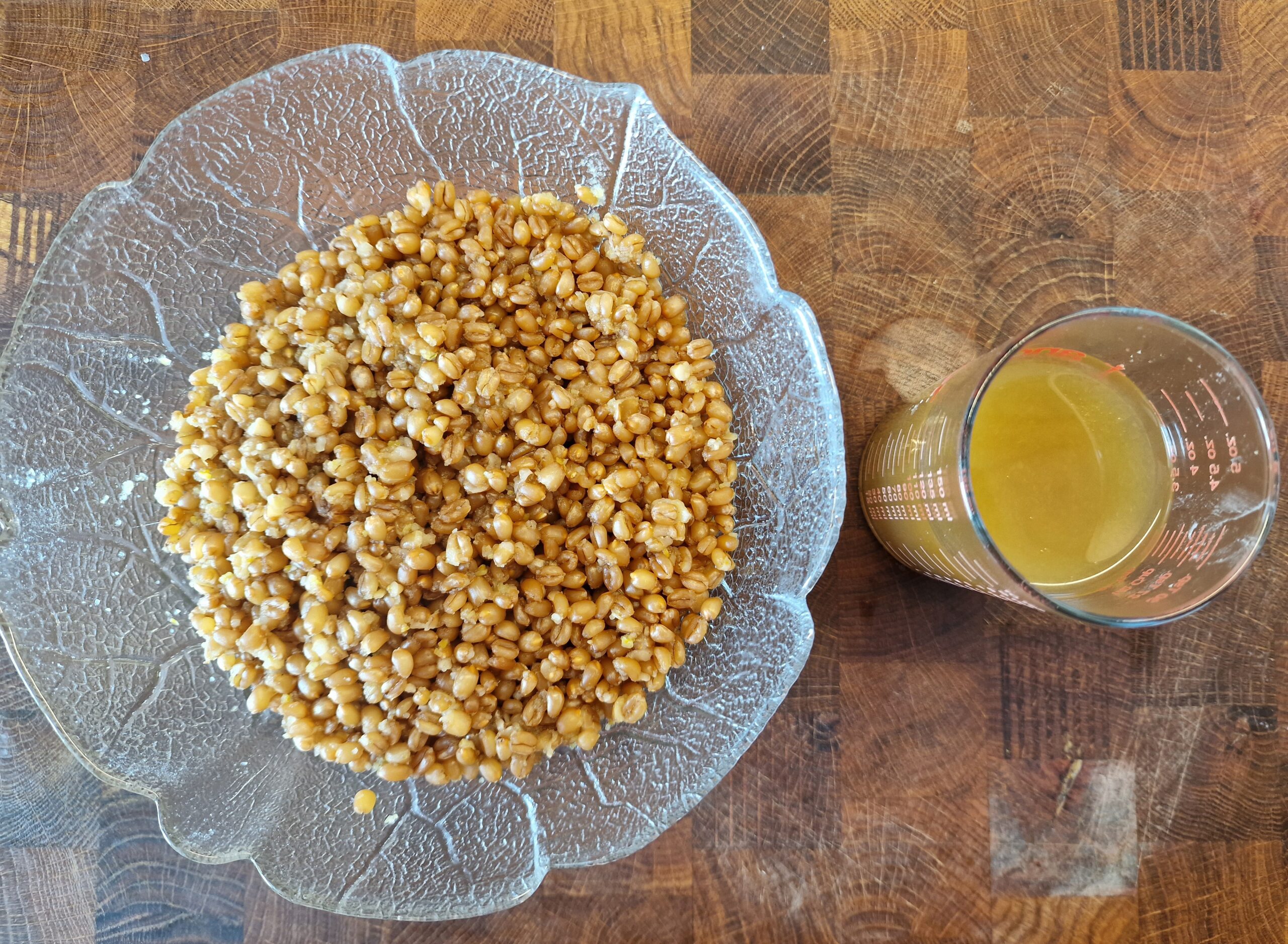 Weizenkörner über Nacht einweichen, was die Kochzeit verkürzt und die Körner bekömmlicher macht, dann mit dem Einweichwasser gut bedeckt 30 bis 40 Minuten köcheln lassen. Abgießen und das Wasser aufbewahren.