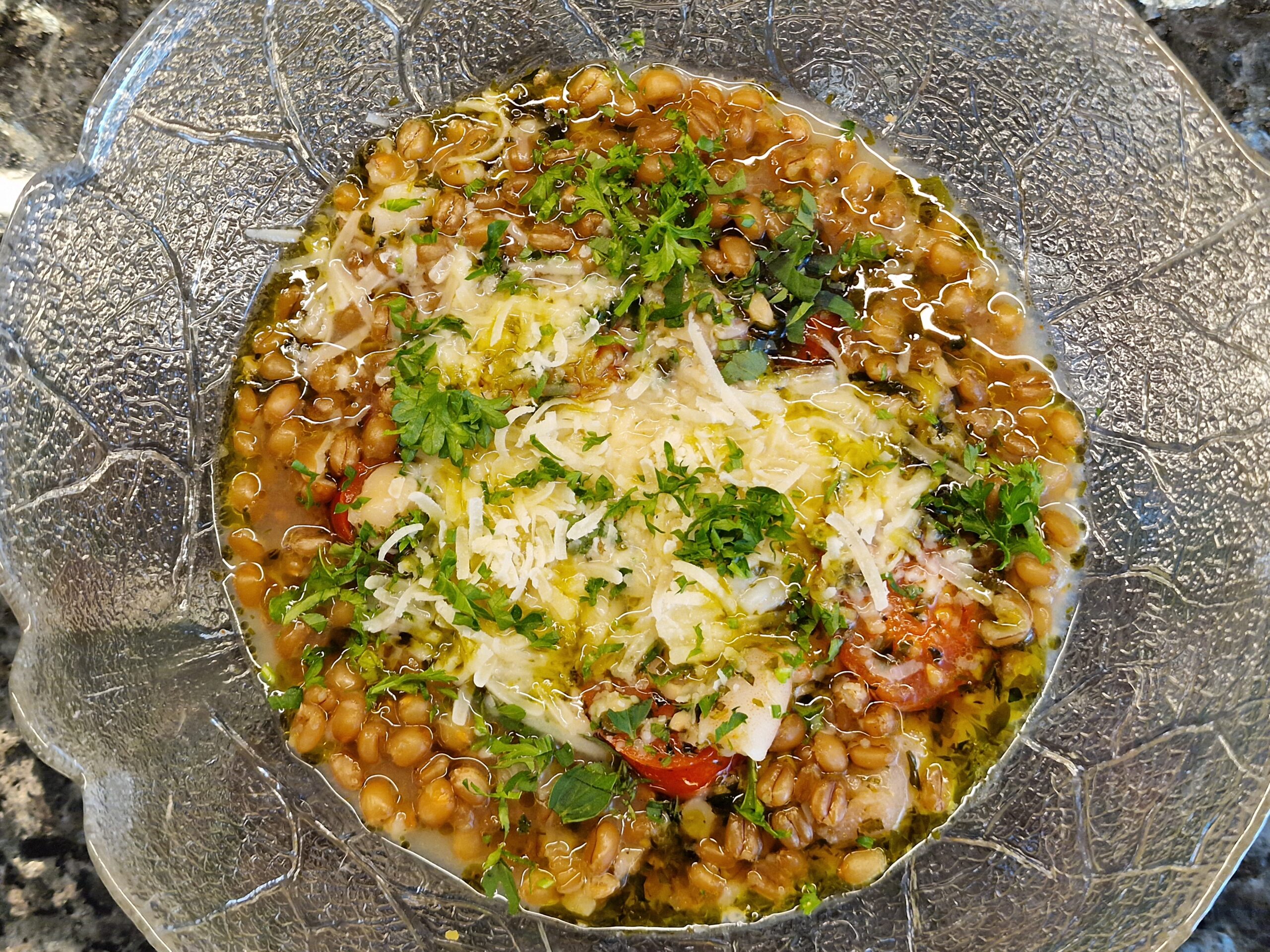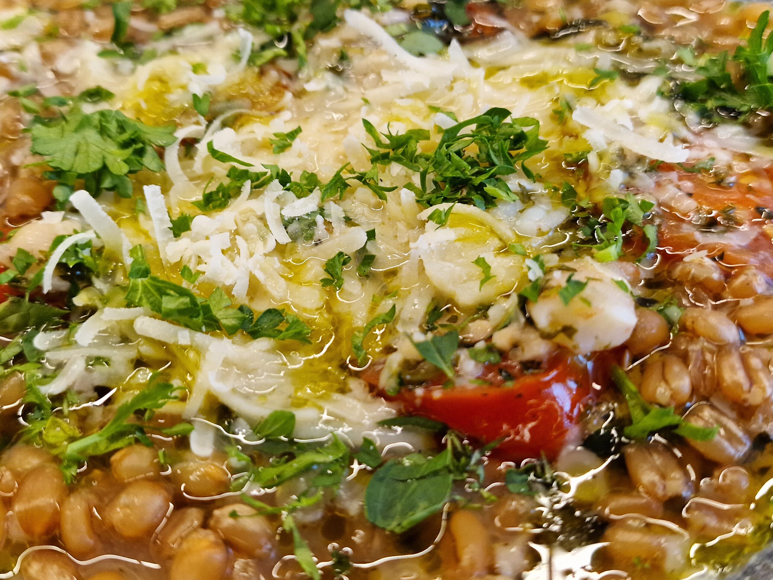 Hartkäse zum Schluss zugeben und das Ganze zum Servieren mit Petersilienresten überstreuen. Dazu die Weizenkörner servieren, mit etwas Limettensaft und Petersilie zum Abschmecken anbieten.
