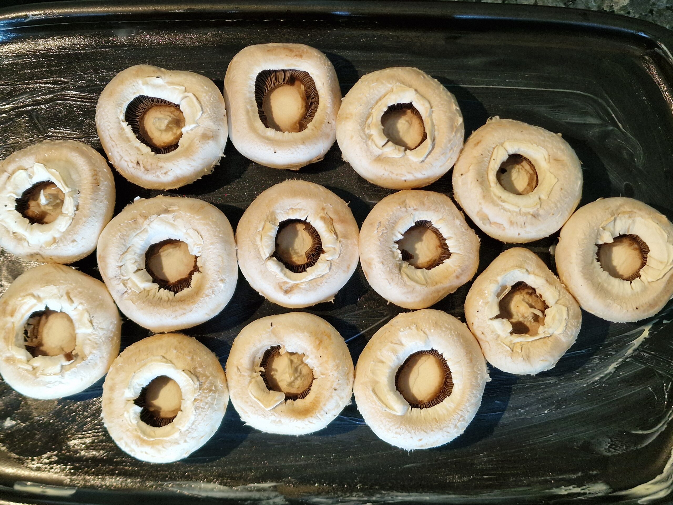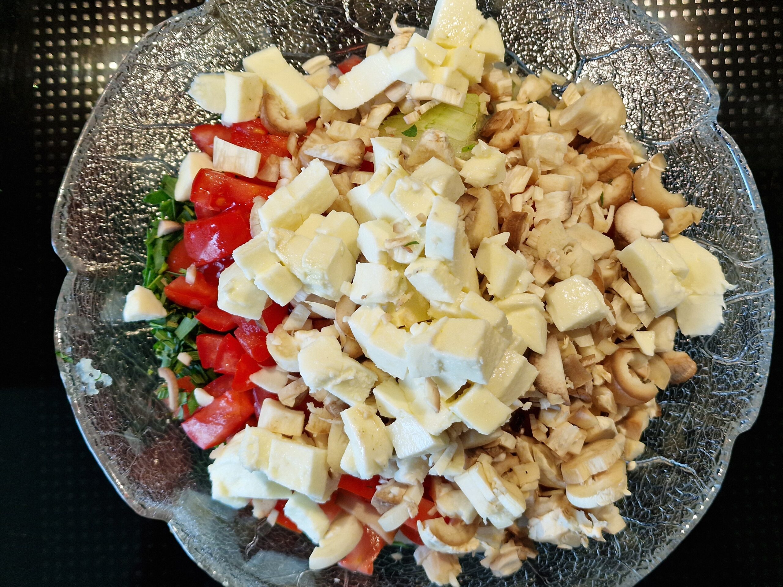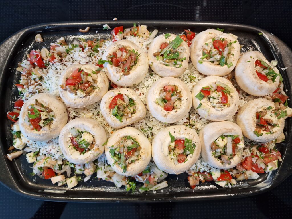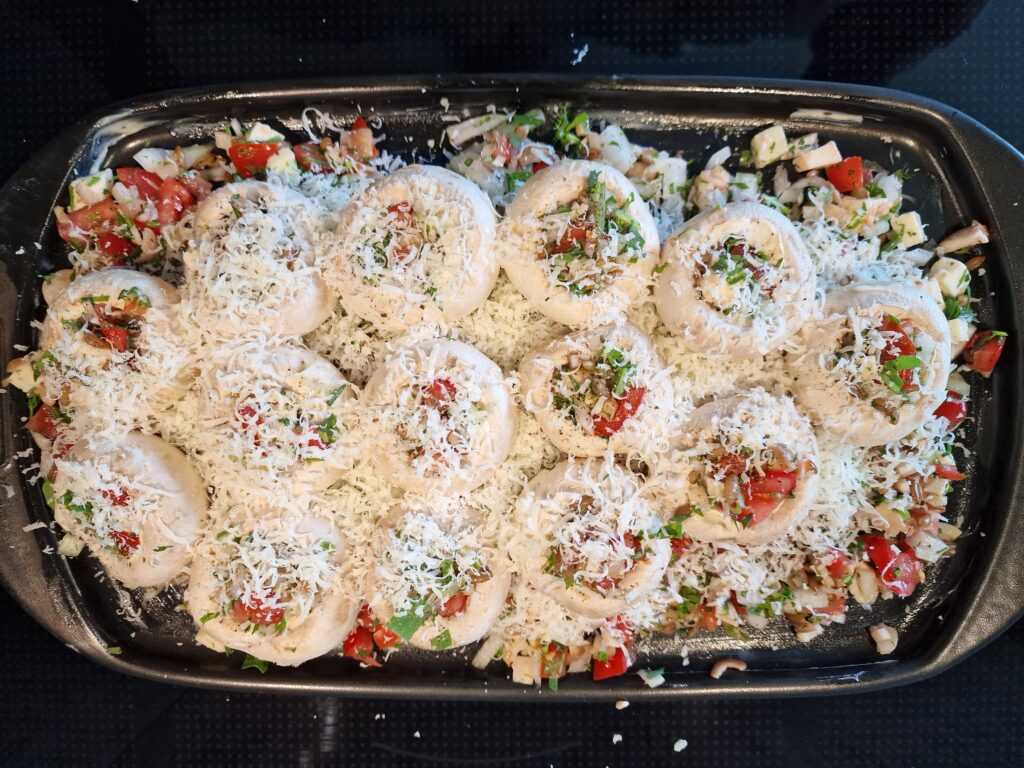 Alle übrigen Zutaten mischen und das Innere der Champignons dazu geben. Die Mischung nun in die Champignon-Hüte einfüllen. Was übrig ist, kann als Unterlage in der Auflaufschale genutzt werden. Mit dem frisch geriebenen Parmesan bestreuen.