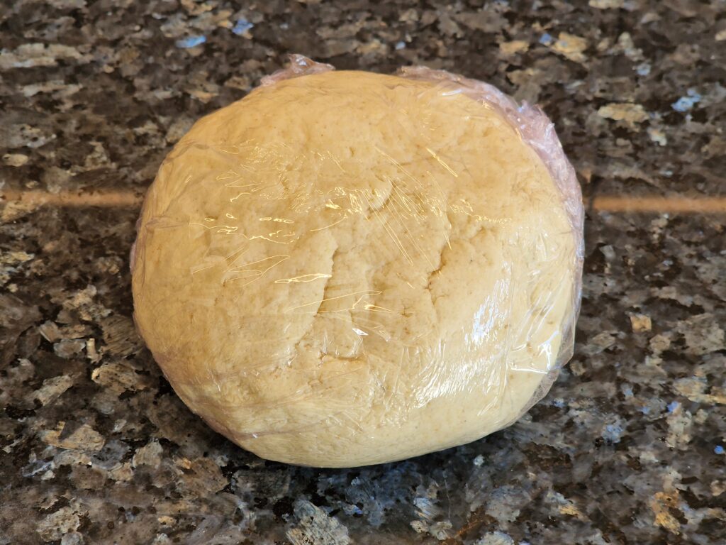 Alle Zutaten mindestens 10 Minuten erst mit der Gabel, dann mit den Händen verkneten, bis ein glatter, elastischer Teig entstanden ist, der nicht mehr klebt. Dabei das Wasser zuletzt immer nur in kleinen Mengen zugeben, sollte der Teig zu hart sein. Den Teig in Frischhaltefolie einschlagen und 30 Minuten im Kühlschrank ruhen lassen.