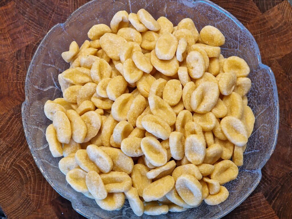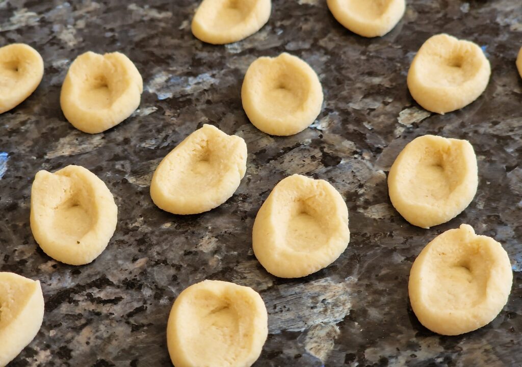 Im Anschluss nochmals kneten, zu Röllchen formen und etwa 5 mm dicke Scheibchen abtrennen. Die Scheibchen durch Eindrücken mit einem leicht gezackten Messer und anschließendes Umstülpen dem Daumen zu kleinen Öhrchen formen. Durch das Umstülpen gelangt die rauhe Seite nach außen und kann später die Sauce besser aufnehmen.