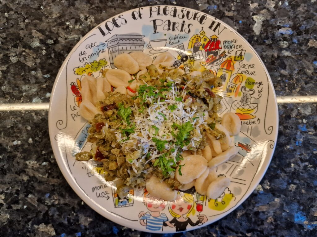 Das Ganze mit den al dente gekochten Orecchiette mischen und geriebenen Hartkäse darüber geben. Zum Servieren mit etwas Limettensaft beträufeln.
