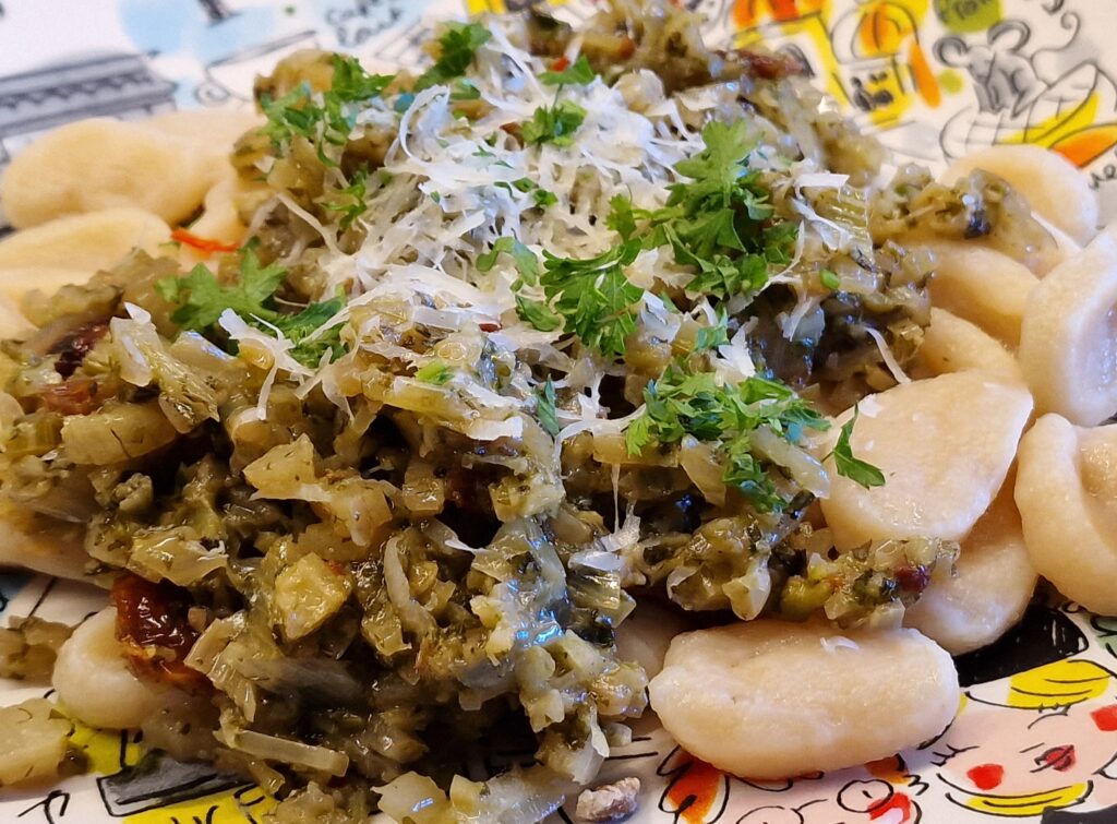 Die Orecchiette werden 8-10 Minuten in sprudelndem Salzwasser gar gekocht – wenn sie frisch sind, reichen auch 3-4 Minuten zum al dente Kochen. Beim Abgießen der Orecchiette das Kochwasser auffangen und wie oben beschrieben für die Sauce verwenden.