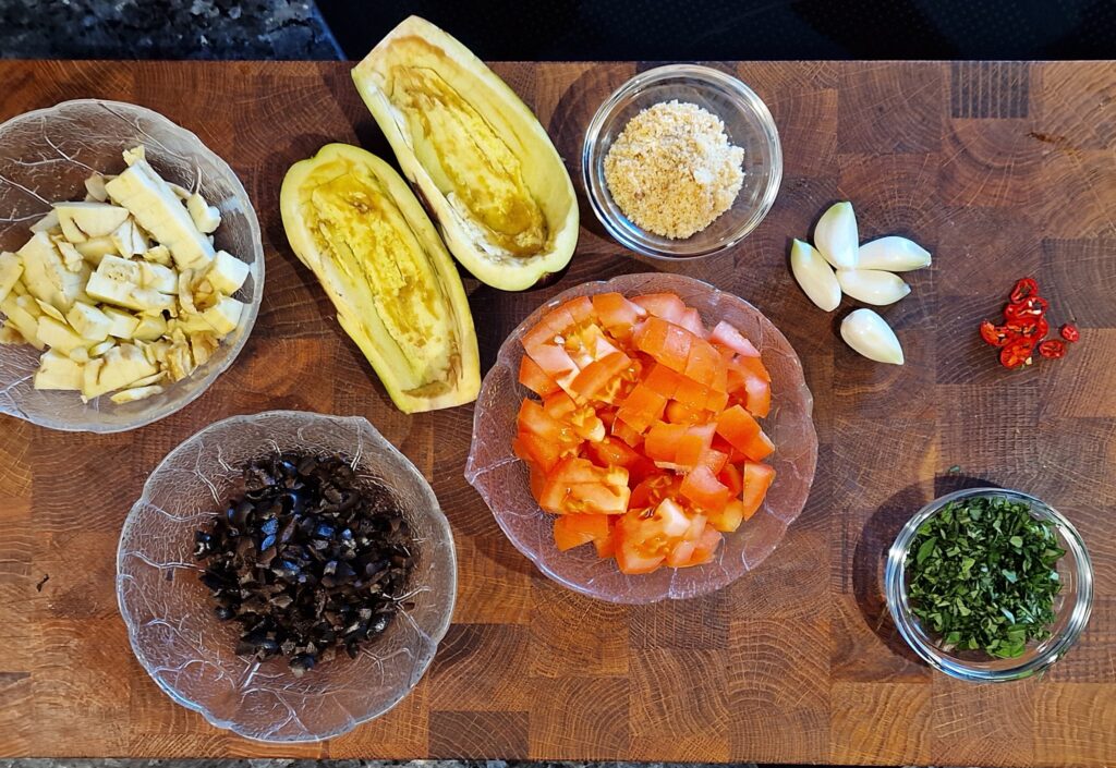 Olivenöl erhitzen, Knoblauch, Basilikum und (optional) Chili anbraten, dann das ausgeschabte und klein geschnittene Auberginenfleisch, sowie die Tomaten hinzugeben, leicht salzen. Bei starker Hitze wird das Ganze nun unter Rühren 5 Minuten angebraten, bis das Auberginenfleisch weich ist. Dann die Hitze abschalten, Oliven und Kapern hinzugeben, kurz abkühlen lassen. Anschließend die Semmelbrösel hinzufügen und alles gründlich vermischen.