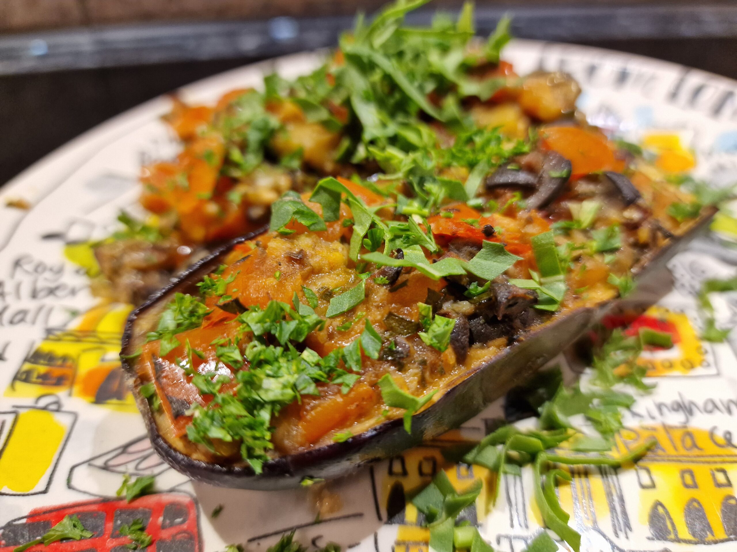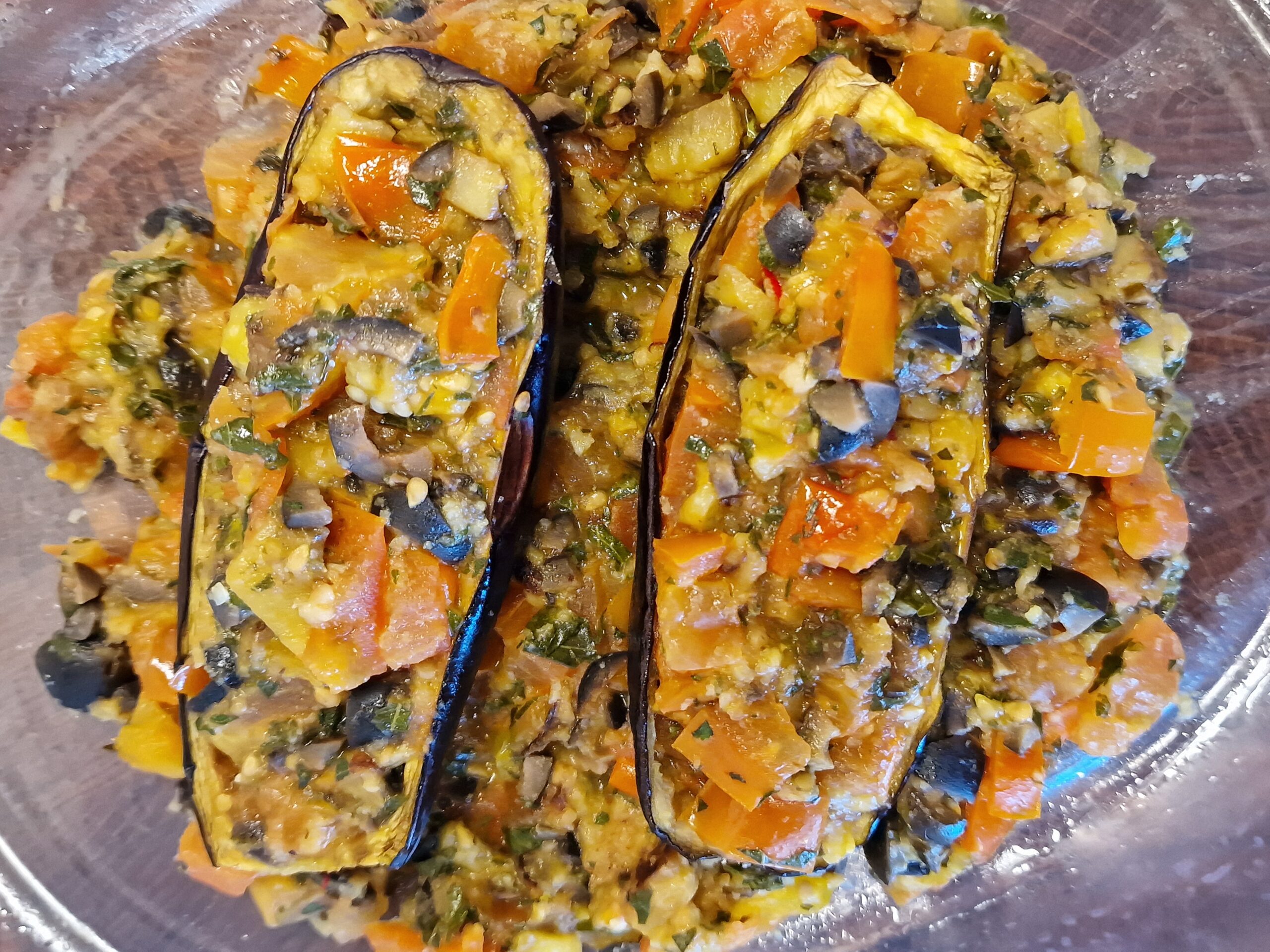 Auberginen waschen und nach dem Trocknen längs halbieren. Fruchtfleisch vorsichtig heraus schaben, so dass die Hülle noch eine Dicke von etwa einem halben Zentimeter behält. Die Auberginenhüllen werden nun auf einem mit Backtrennpapier ausgelegten Backblech mit Olivenöl etwas eingefettet und gesalzen. Im Anschluss werden sie 7 Minuten im auf 150°C (Ober/Unterhitze) vorgeheizten Ofen gebacken, gewendet und weitere 7 Minuten gebacken. Im Anschluss die Auberginenhüllen herausnehmen und abkühlen lassen.