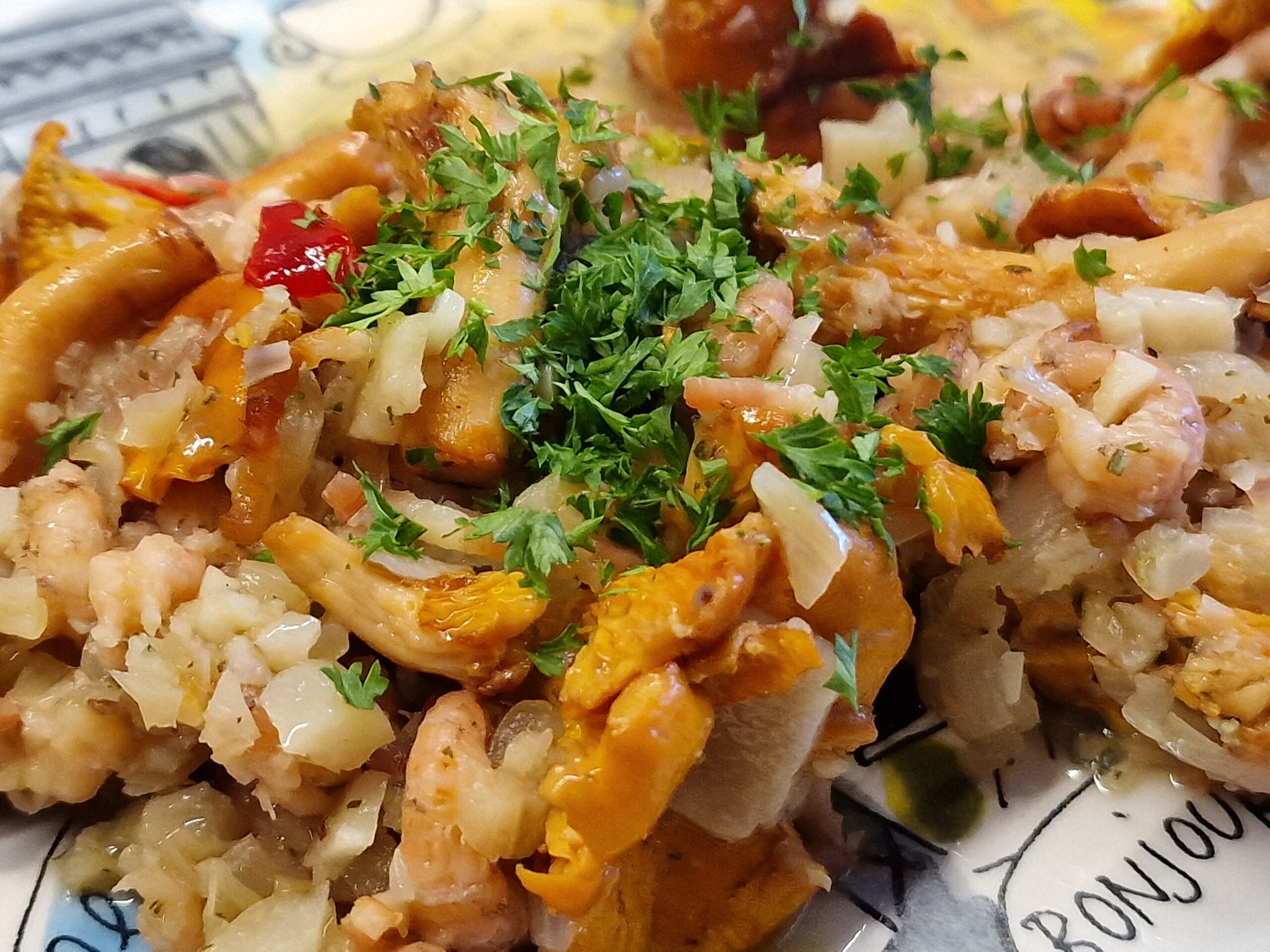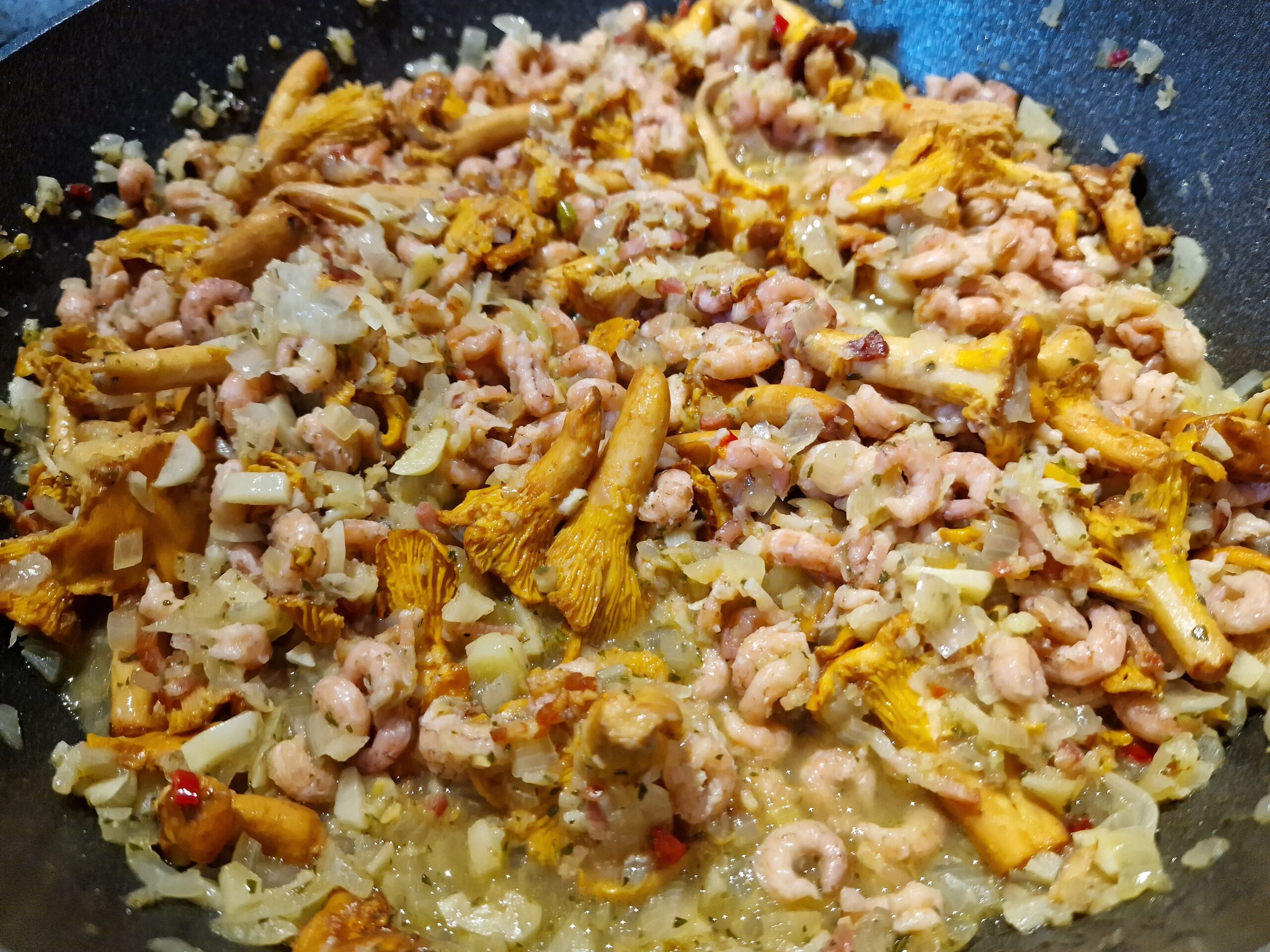 Bacon in Butter mit den Kräutern auslassen. Knoblauch, Chili, Salz und Ingwer zugeben, zum Schluss Zwiebeln zugeben und alles bei niedriger Hitze abgedeckt schmoren lassen, bis die Zwiebeln glasig und goldbraun sind. Pfifferlinge zugeben und bei etwas höher gestellter Hitze alles schmoren lassen. Zum Schluss die Krabben untermischen und mit etwas frisch gehackter Petersilie bestreuen – guten Appetit.