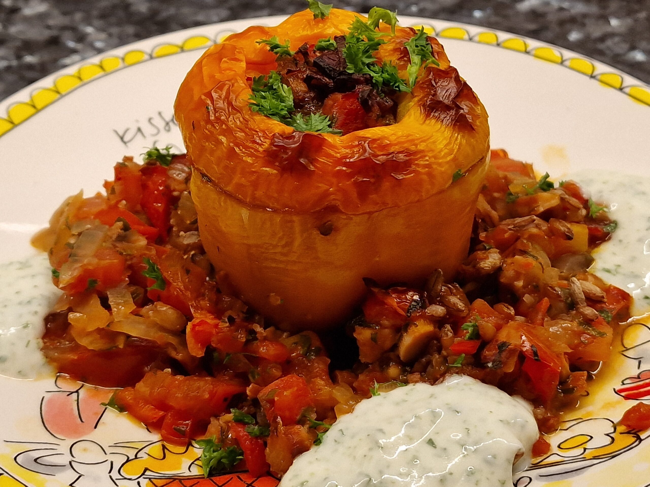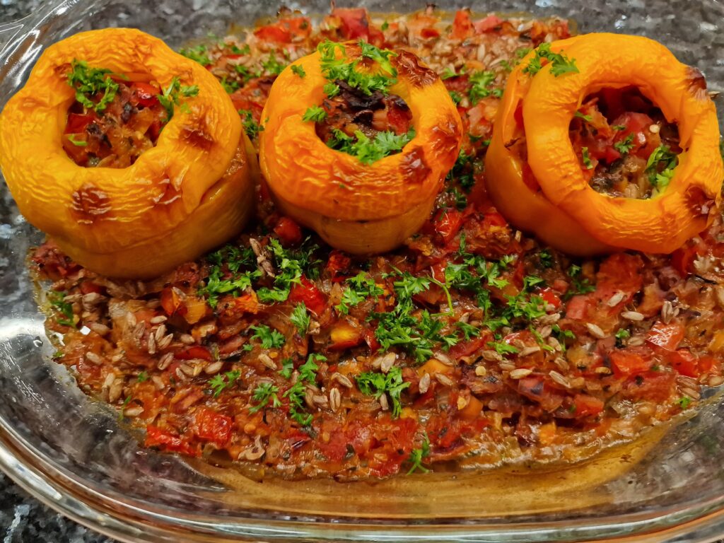 Tipp: Die Füllung funktioniert auch mit Couscous, diesen zuvor mit heißem Wasser übergießen und 10 Minuten ziehen lassen. Auch Hirse ist eine Alternative, diese muss zuvor ähnlich wie Reis mit Wasser im Verhältnis 1:2 aufgekocht werden und dann 30 Minuten ziehen.