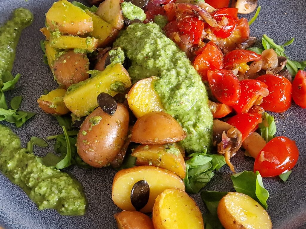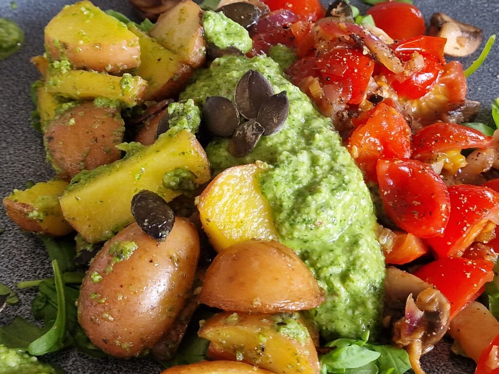 Bratkartoffeln in Olivenöl anbraten und auf niedriger Hitze etwa eine halbe Stunde unter gelegentlichem Rühren schmoren lassen. Zum Ende hin Pesto zugeben und kurz mit durchbraten lassen, sonst schmeckt unter Umständen die Knoblauchschärfe durch.