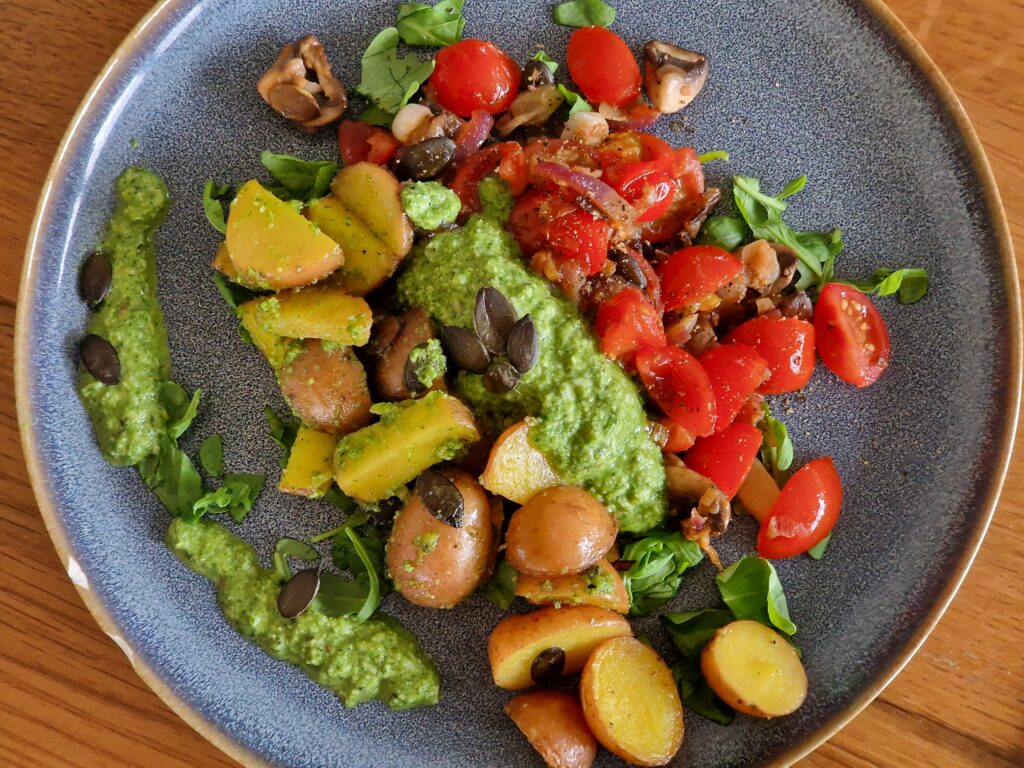 Zum Servieren alles mischen und den restlichen frischen Rucola grob geschnitten zugeben. Mit Kürbiskernen toppen und etwas restliches Pesto darum garnieren.