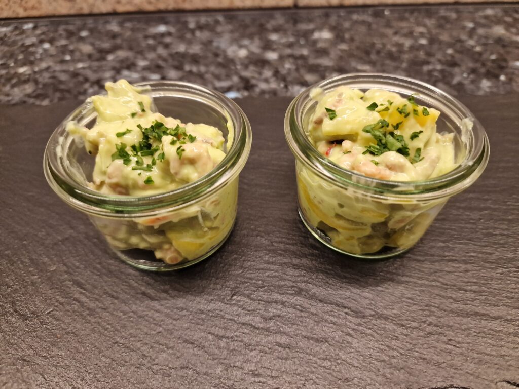 Avocado mit Joghurt, Knoblauch und Chili in den Blender geben und zu einer glatten Masse verarbeiten. Krabben und Mangowürfel in eine Schüssel geben, mit der Avocadomasse übergießen und durchrühren. Dies ist ein sehr schnelles Rezept.