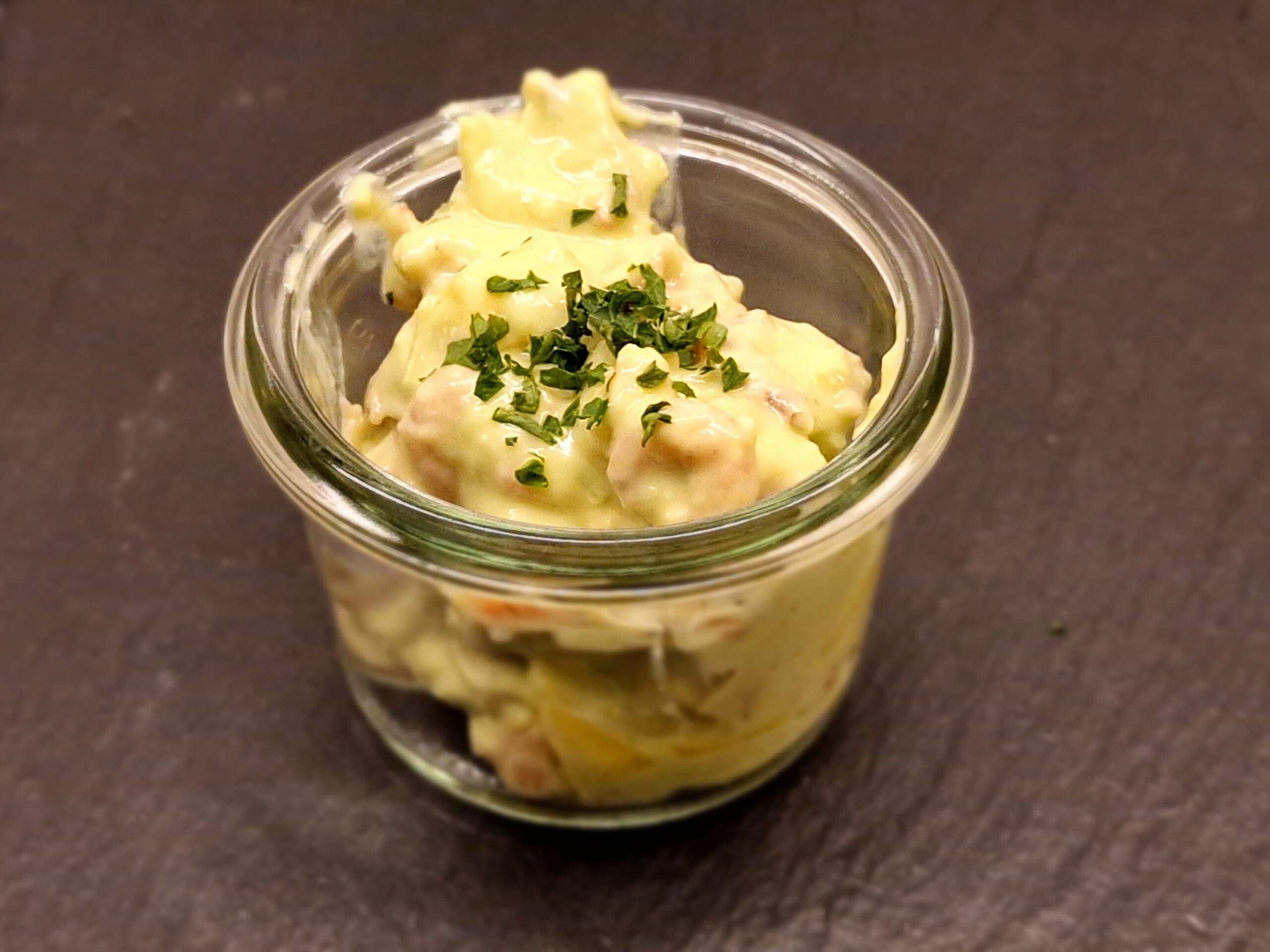 Avocado mit Joghurt, Knoblauch und Chili in den Blender geben und zu einer glatten Masse verarbeiten. Krabben und Mangowürfel in eine Schüssel geben, mit der Avocadomasse übergießen und durchrühren. Dies ist ein sehr schnelles Rezept.