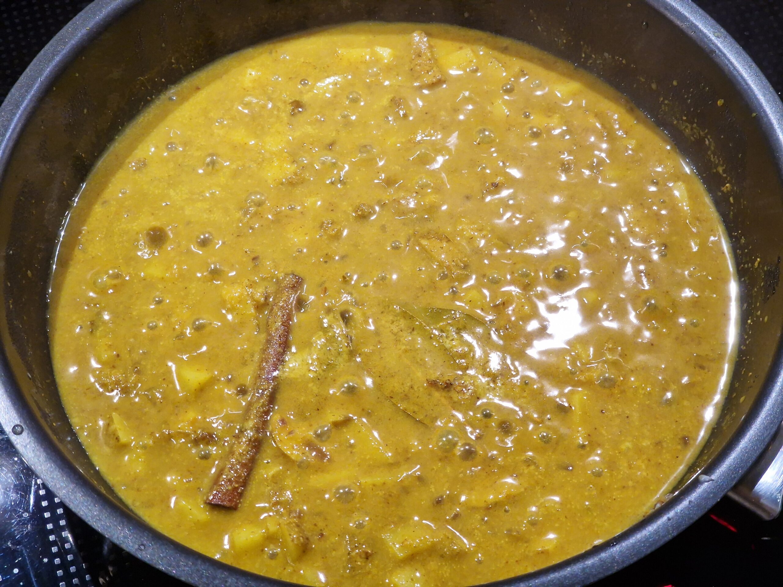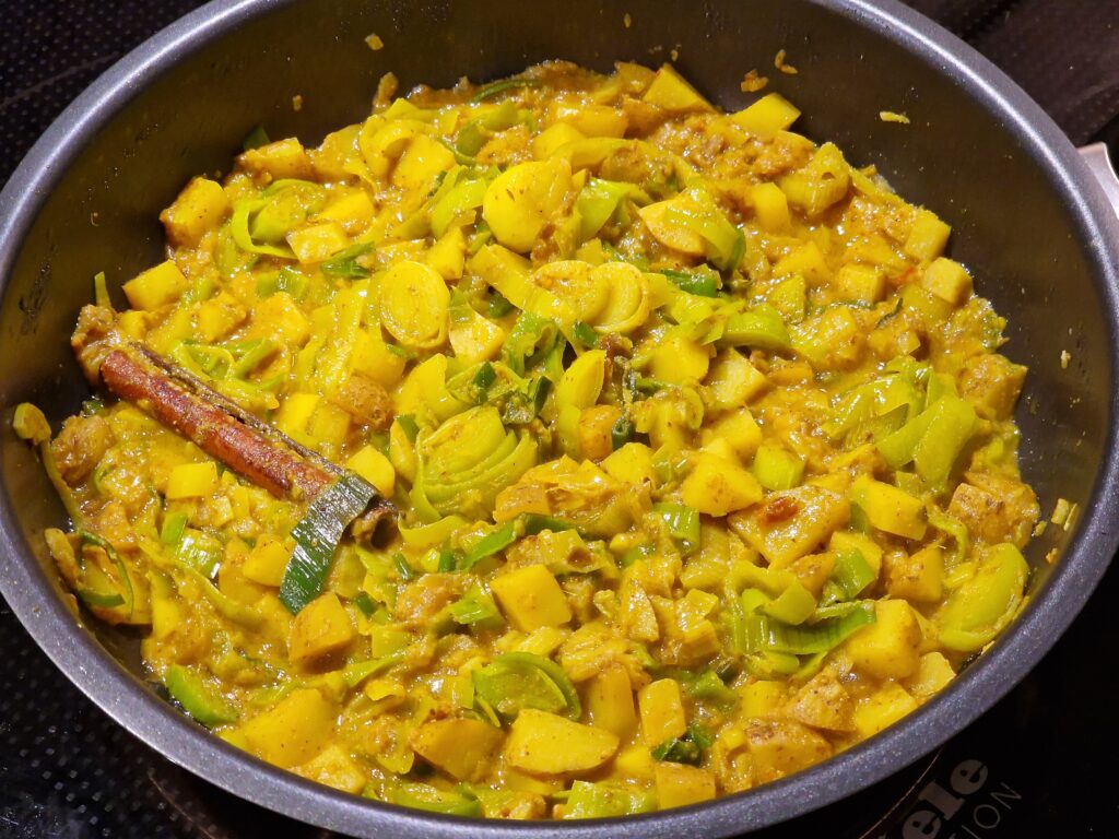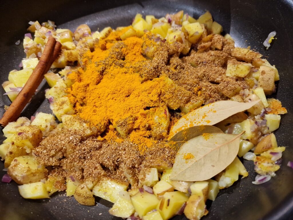 Ingwer, Knoblauch und Schalotten in Öl anbraten, Kartoffeln zugeben. Die gerösteten, gemahlenen Gewürze, sowie Kurkuma, Chili und eine Prise Salz zugeben, kurz mit anrösten. Das Ganze mit Kokosmilch ablöschen. Curryblätter und Zimt zugeben und alles 5 Minuten köcheln lassen.