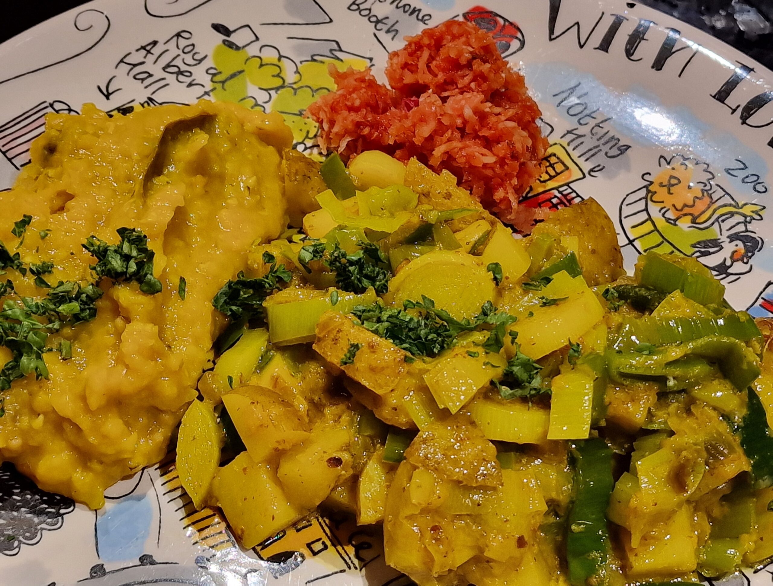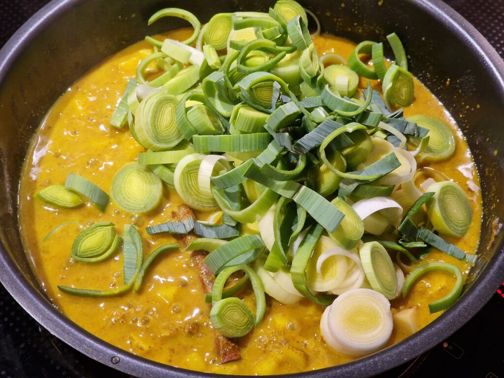 Nun die Porree Ringe zugeben und alles offen weiterköcheln lassen bis das Gemüse gar ist, es sollte aber noch bissfest sein. Mit etwas Limettensaft und Salz abschmecken und mit gehacktem Koriander bestreut servieren.