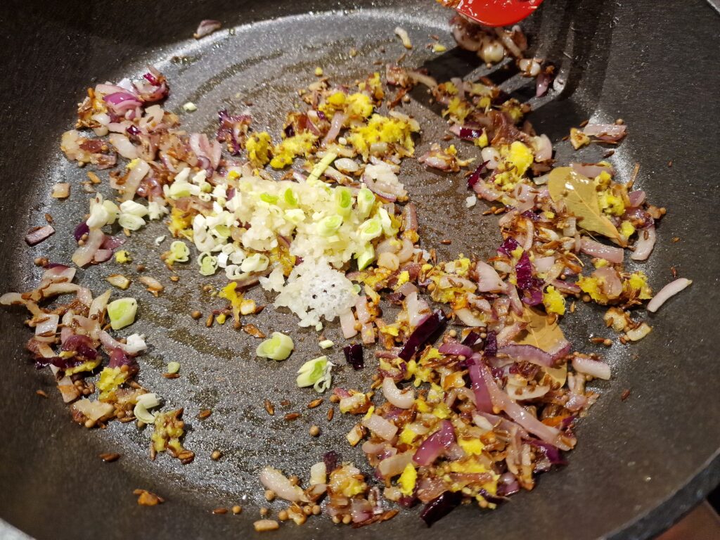 Öl erhitzen und Curryblätter zugeben, anschließend Kreuzkümmel- und Senfkörner anrösten, bis sie springen. Nun die Zwiebel hineingeben und goldgelb anbraten, etwa 10 Minuten. Ingwer, Knoblauch, Chili, schwarzen Pfeffer, Tomaten und Karotten hinzufügen und 5 Minuten unter Rühren köcheln lassen.
