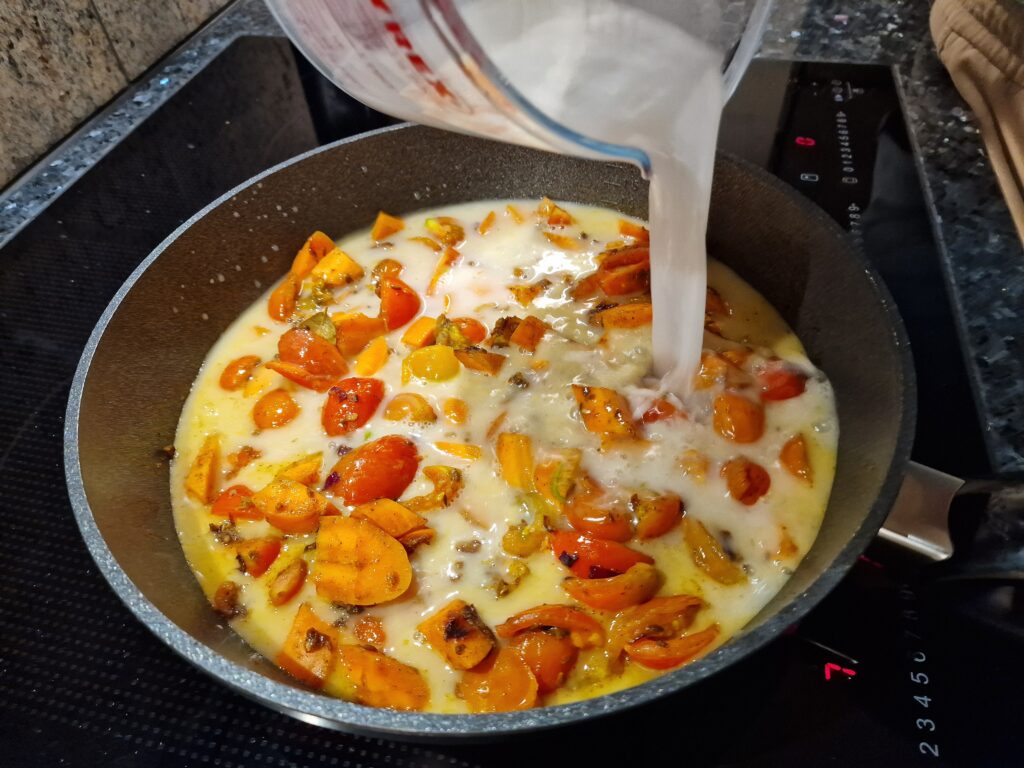 Tipp: Eine Variante ist die Addition von 1 Stange Porree, in feine Ringe geschnitten, etwas nach der Zugabe von Möhren und der Kokosmilch.