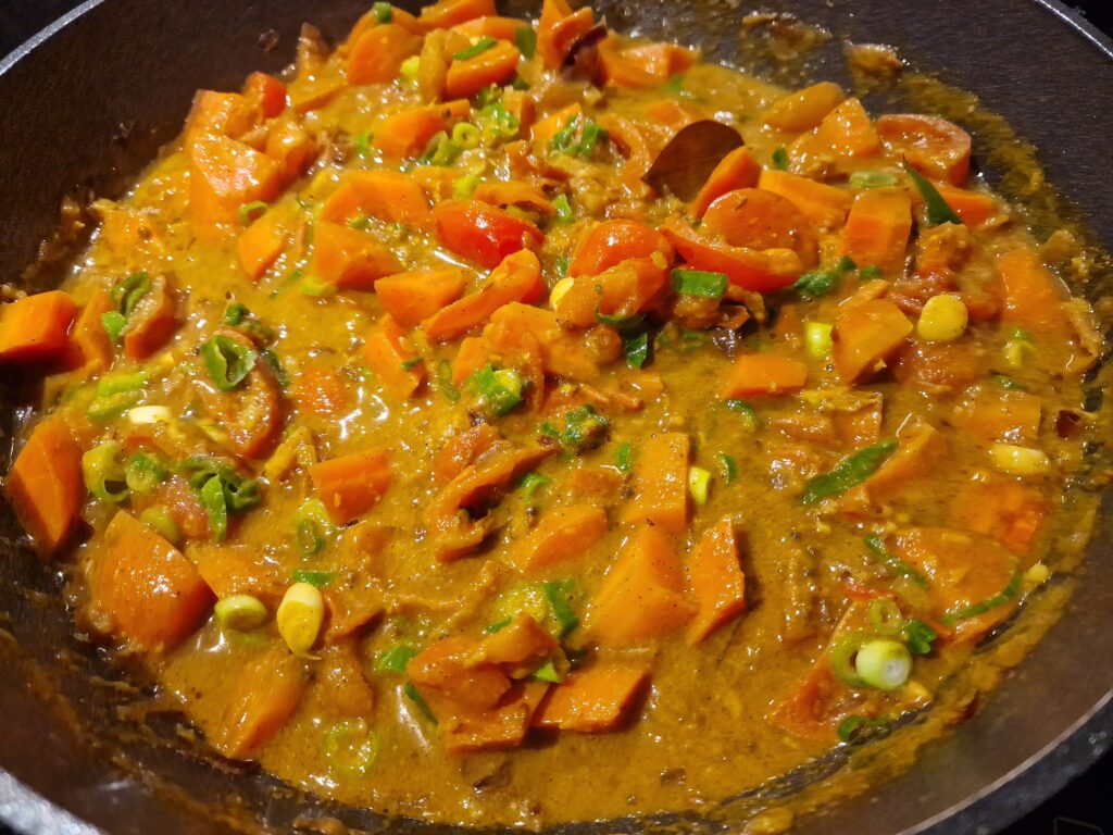 Ein weiteres Gericht aus der Sri Lanka Küche, wichtig dabei ist die Möhren in groben Stücken zu verarbeiten, was sie besonders zart macht. Die Kokosmilch wird gewonnen wie unter dem Rezept Dhal beschrieben. Eine eventuell mögliche Alternative für Eilige ist Kokosmilch aus der Dose.