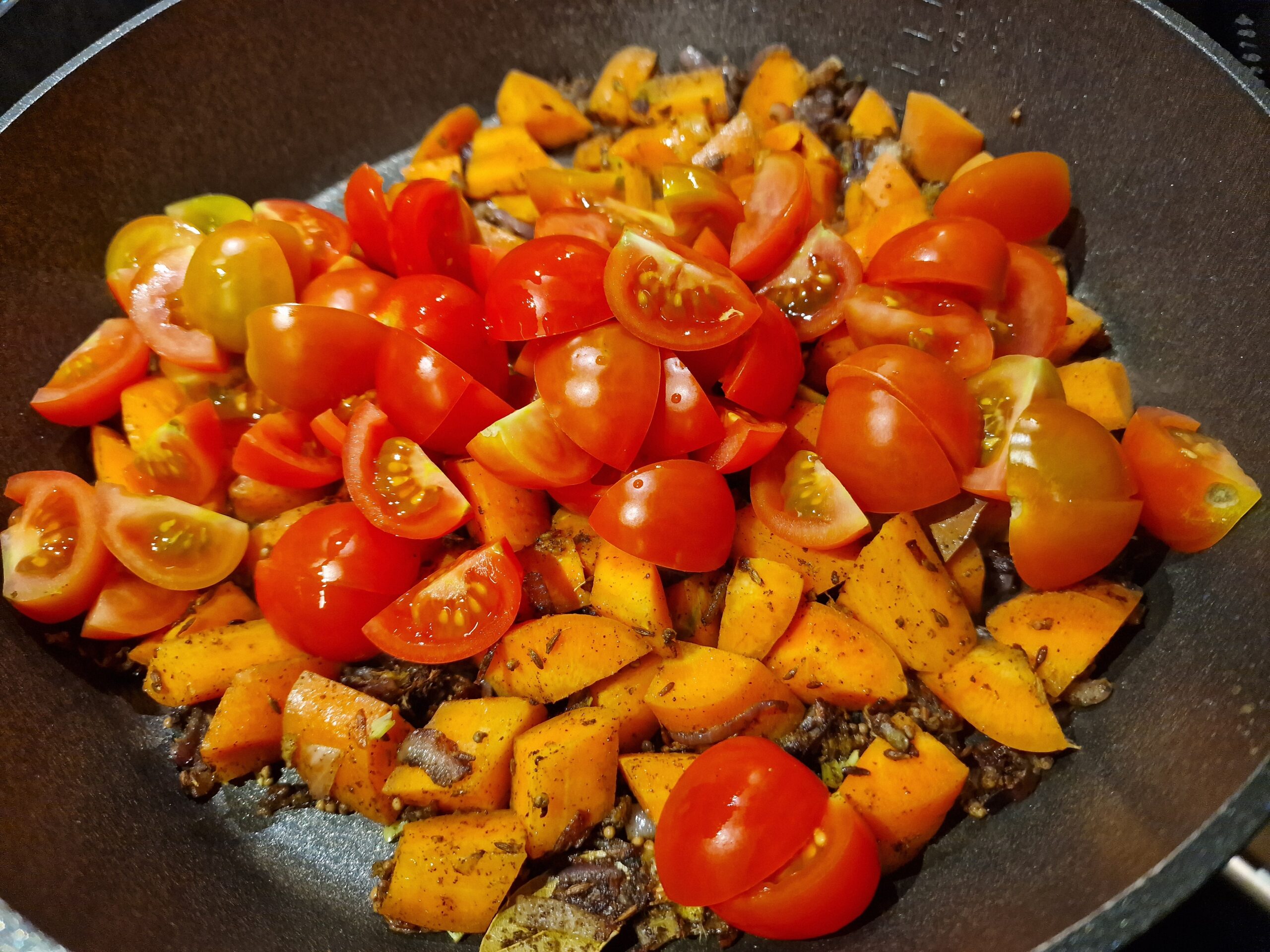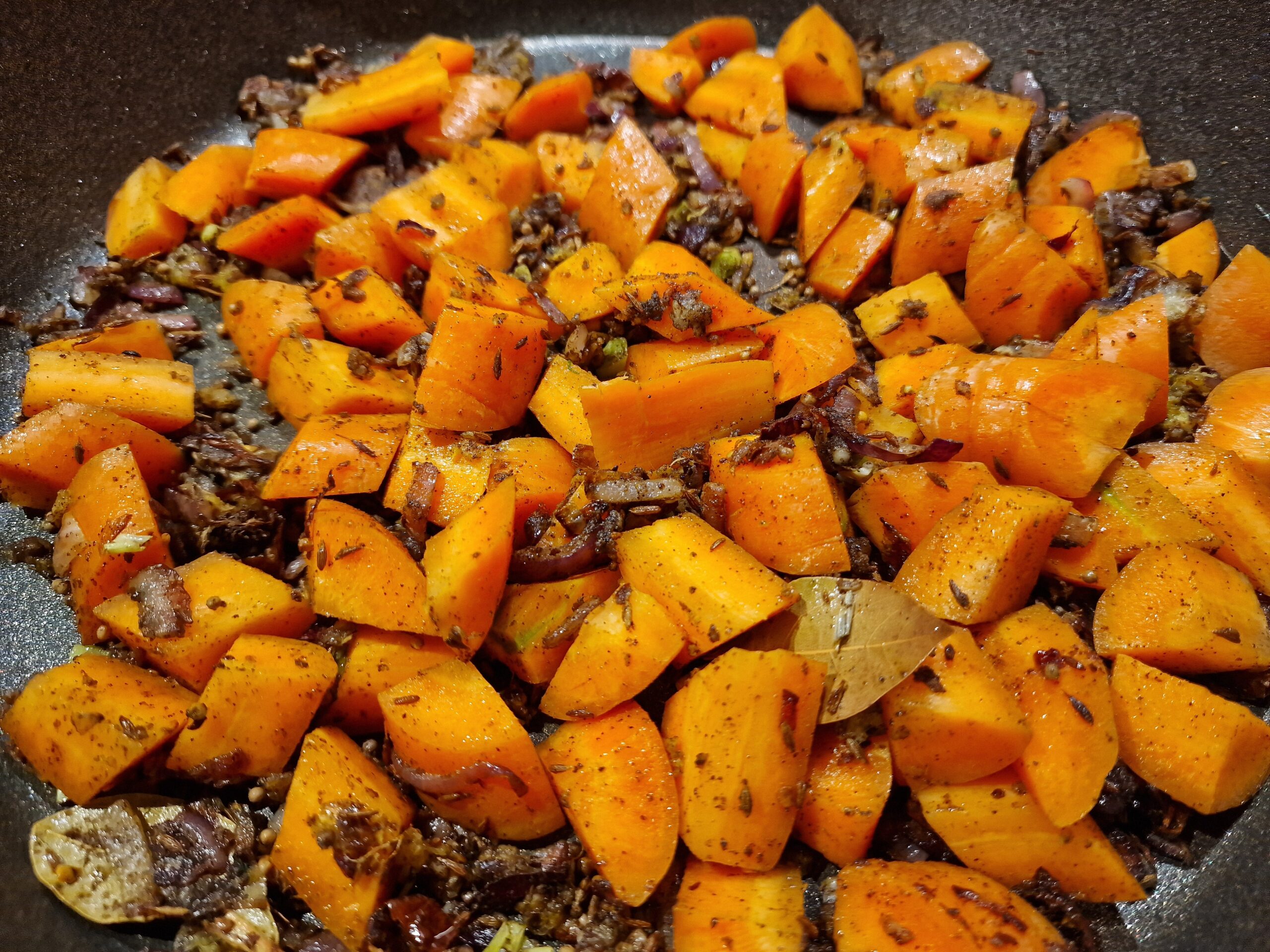 Öl erhitzen und Curryblätter zugeben, anschließend Kreuzkümmel- und Senfkörner anrösten, bis sie springen. Nun die Zwiebel hineingeben und goldgelb anbraten, etwa 10 Minuten. Ingwer, Knoblauch, Chili, schwarzen Pfeffer, Tomaten und Karotten hinzufügen und 5 Minuten unter Rühren köcheln lassen.