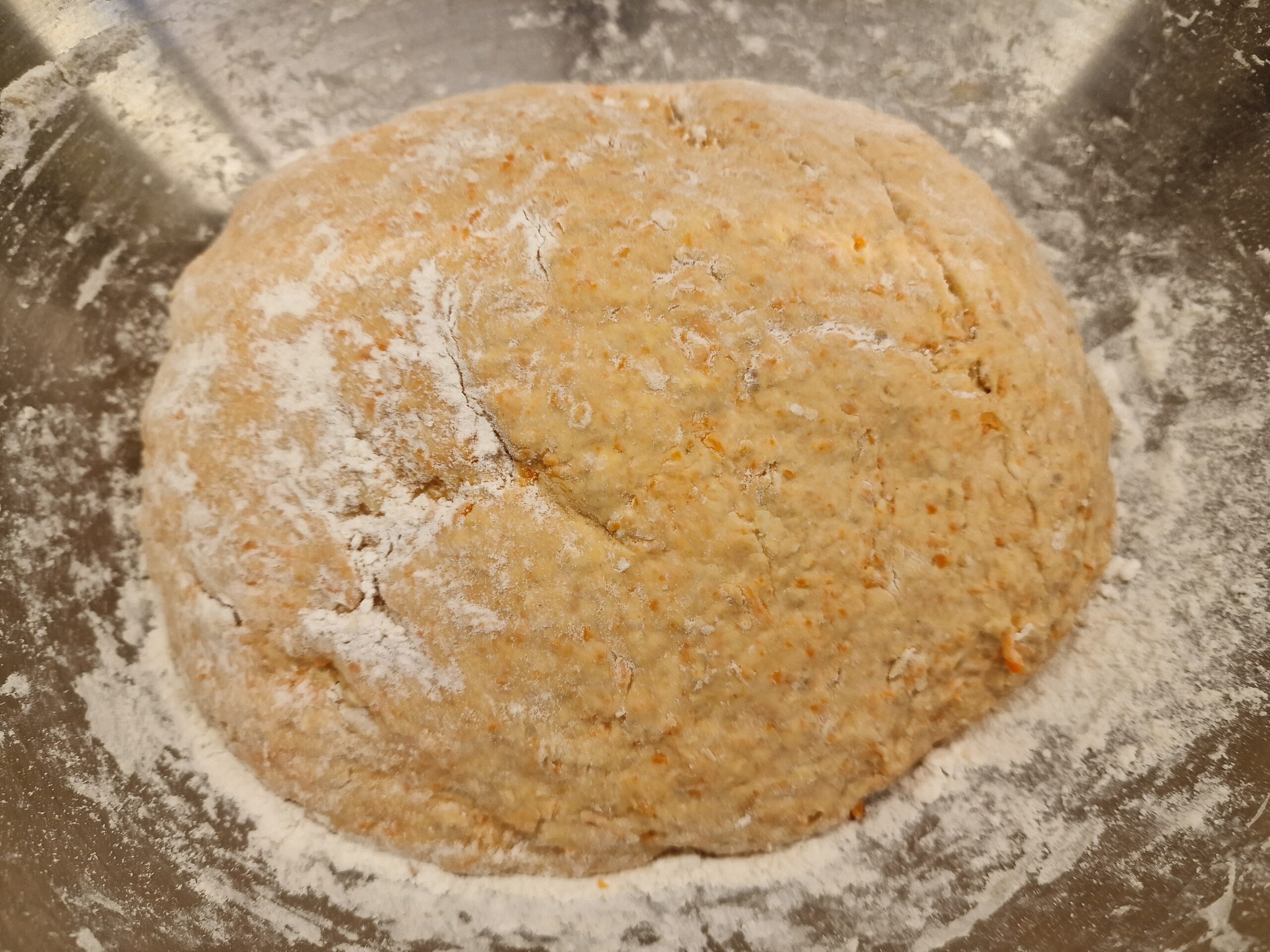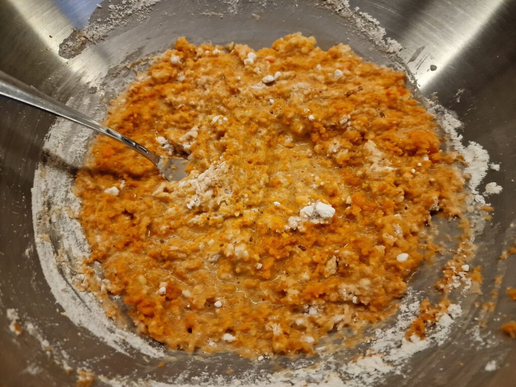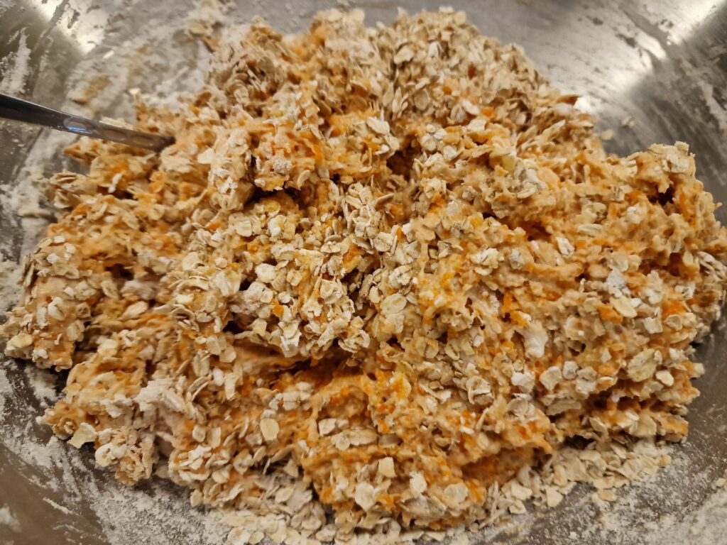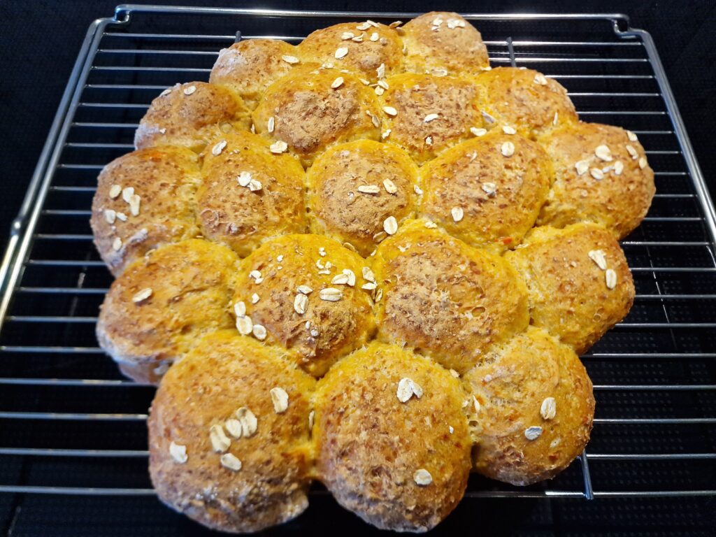 In der Zwischenzeit die Möhren mit Knoblauch und Kartoffel manuell oder mit der Küchenmaschine raspeln. Nun den Vorteig und die Haferflocken dazu geben und alles vermengen. Abwechselnd Wasser und Dinkelmehl zugeben und gut verkneten, bis der Teig elastisch und nicht mehr klebt. Den Teig gehen lassen, bis er sich verdoppelt hat (etwa eine halbe bis eine Stunde je nach Umgebungstemperatur im Raum). Brotlaibe oder Bällchen für eine Teigsonne formen und das Ganze auf ein mit Backtrennpapier ausgelegtes Backblech geben.
