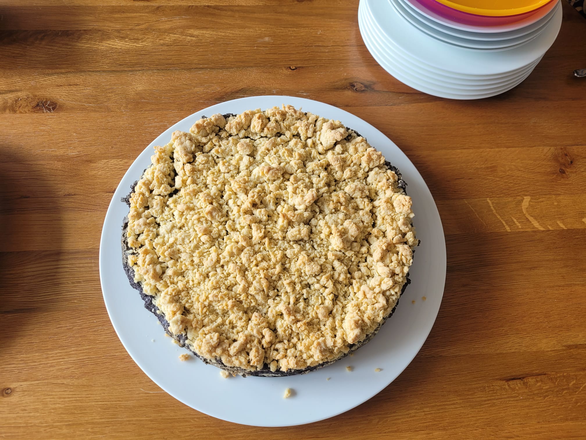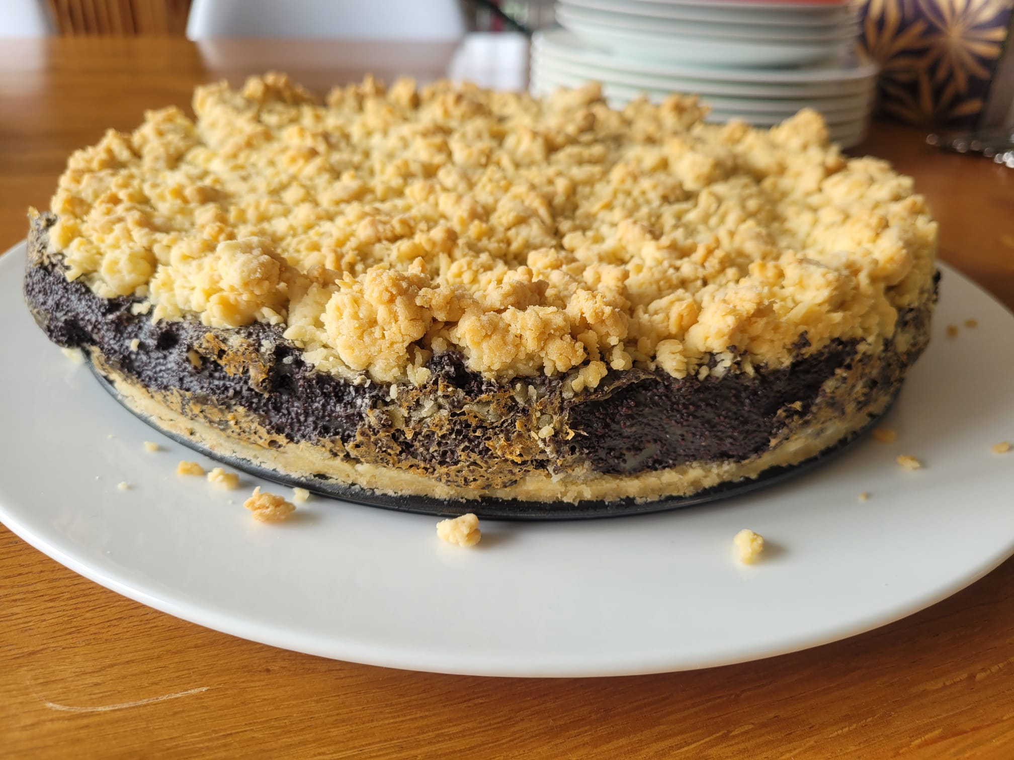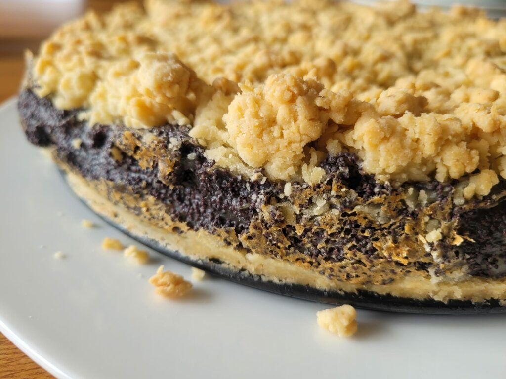 Für die Füllung die Milch mit Zucker, Vanillepaste und Mohn aufkochen. Die Speisestärke mit etwas Milch anrühren um Klümpchen zu vermeiden und dann die Stärke zur Mohnmischung geben und unter ständigem Rühren erneut aufkochen. Die Füllung nun in die mit Teig vorbereitete Form füllen und die Streusel darauf verteilen.