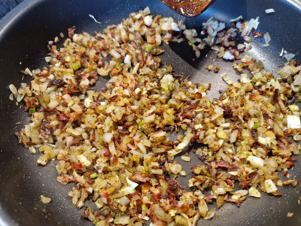 Bacon auslassen. Zwiebeln mit Knoblauch mit einem Restchen Butter andünsten, bis sie glasig sind. Etwas Estragon und Rosmarin zugeben. Mit Honig kandieren und Saft einer halben Limette zugeben.