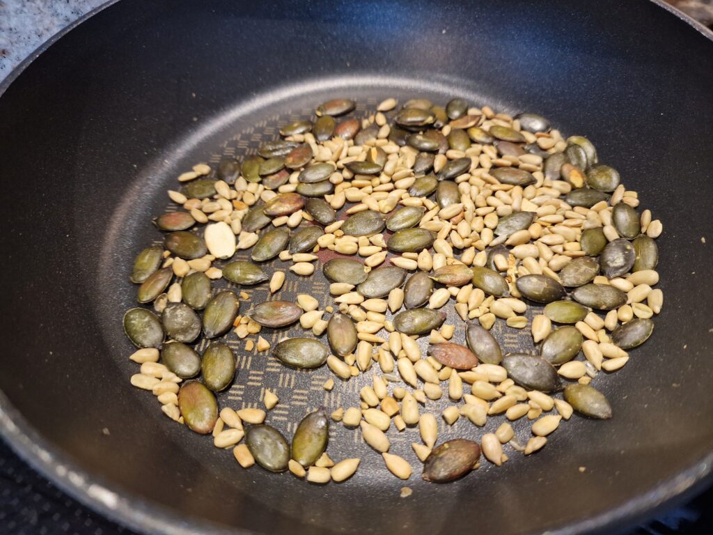 Kürbiskerne mit den Sonnenblumenkernen fettfrei anrösten bis die Kürbiskerne leicht aufgeplatzt sind und etwas Aroma in der Luft liegt.