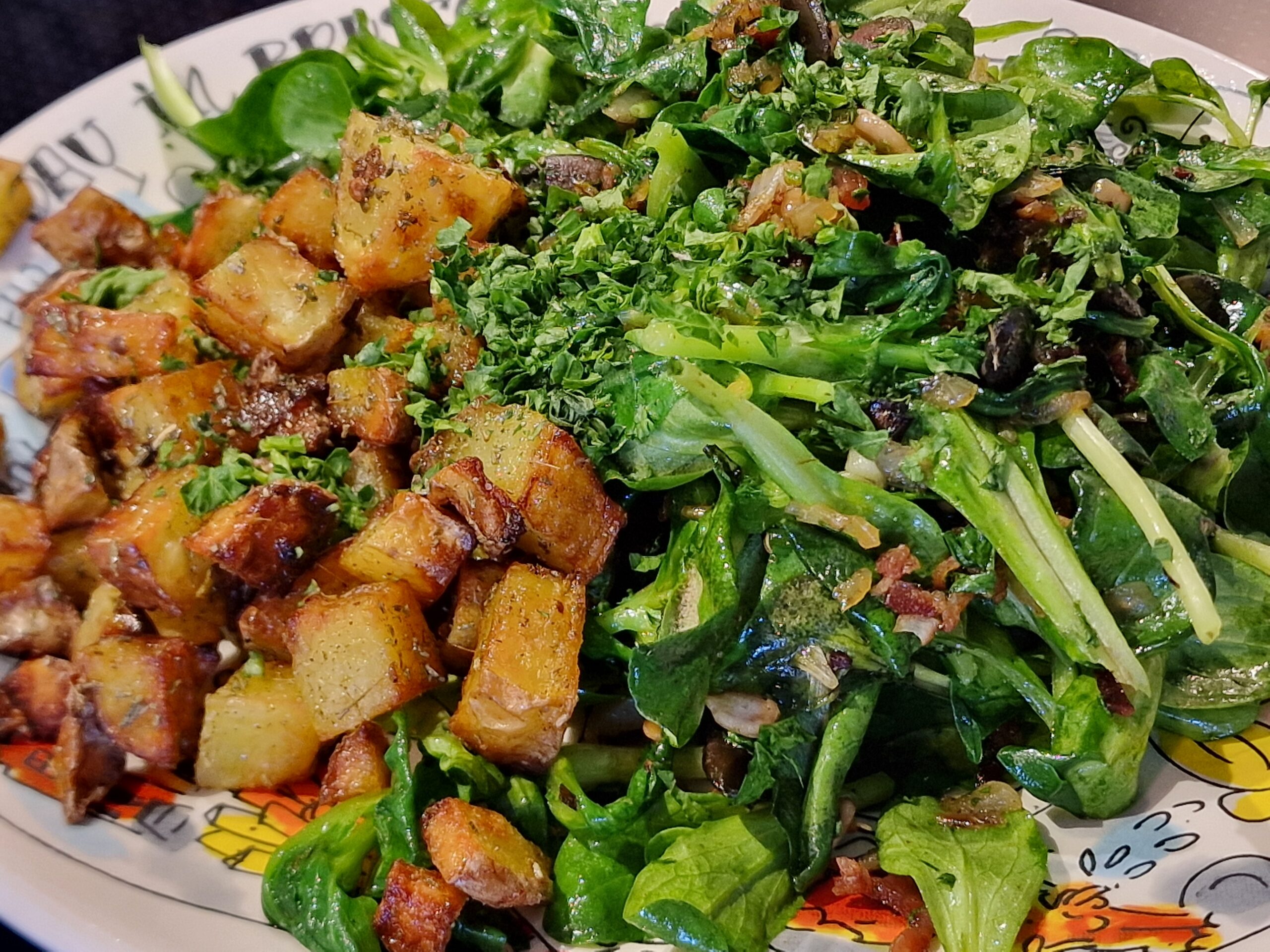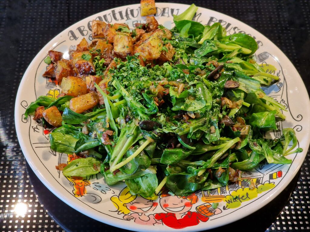 In April kann es bereits eine Menge Feldsalat geben, wir fangen an uns – neben der klassisch norddeutschen Zubereitung als grüner Salat mit Joghurtsauce – nach vielen weiteren unterschiedlichen Rezepten auch aus regionaler Küche umzuschauen. Hier haben wir eines mit Bratkartoffeln probiert und es hat uns geschmeckt.