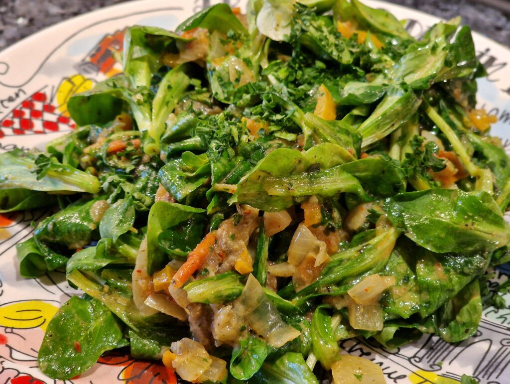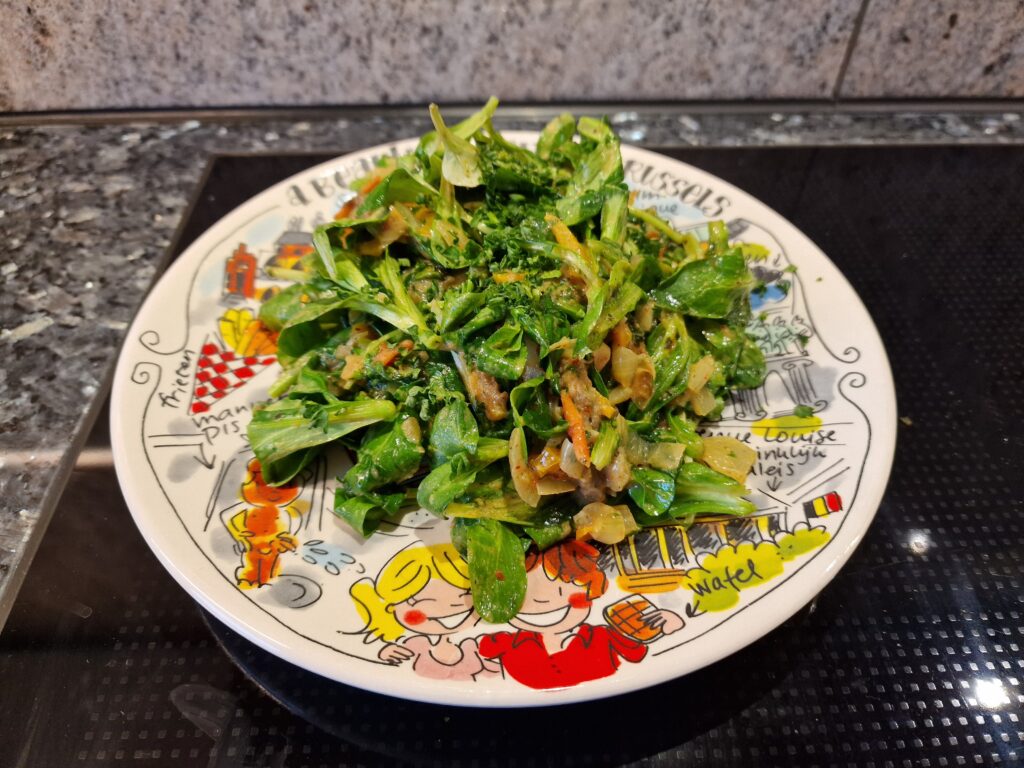 Feldsalat in allen Variationen im April, solange der Vorrat im Garten reicht. Neben Feldsalat klassisch mit Joghurtsauce als Beilage, Feldsalat zu Burgern, Feldsalat als Beilage zu Omelett und so weiter schmeckt das Gemüse auch als warmes Gericht.