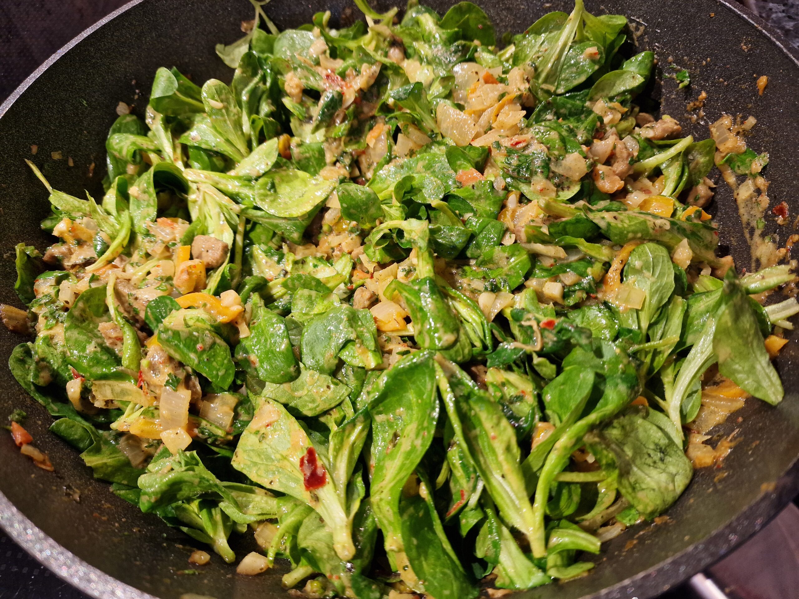 Zum Schluss Feldsalat kurz leicht dabei unterheben, so dass auch beim Anbraten die Struktur des Grüns erhalten bleibt.