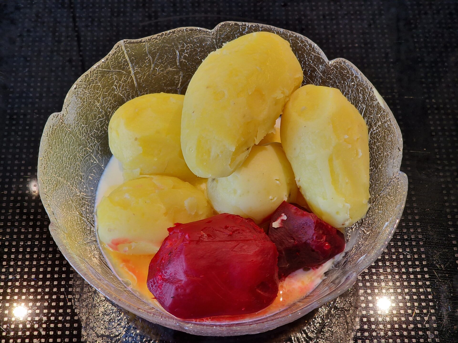 Kartoffeln und Rote Bete mit Salzwasser bedeckt zum Kochen bringen und abgedeckt 25 Minuten garen.