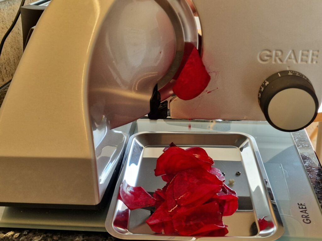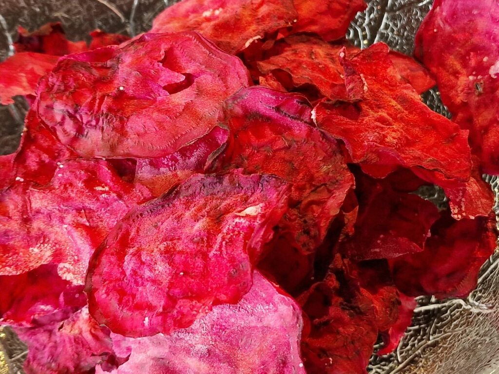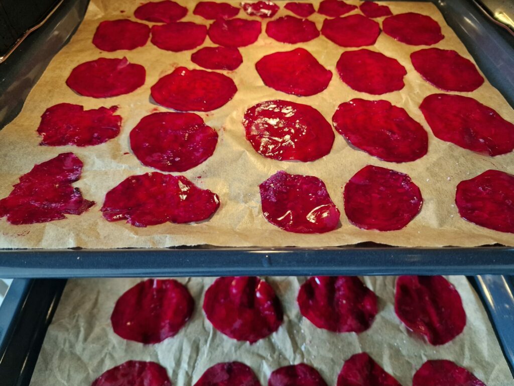 Rote Bete schälen und mit der Küchenmaschine in dünne Scheiben schneiden. Backbleche mit Backtrennpaper auslegen. Rote Bete Scheiben einzeln darauf verteilen, leicht mit etwas Salz bestreuen. Bei 90°C (Umluft) für 90 Minuten crisp trocknen lassen. Immer wieder überprüfen, damit die Chips nicht dunkel werden. Nach etwa 30 Minuten wenden.